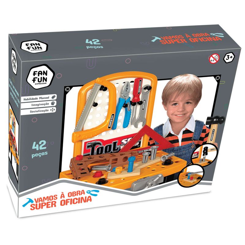 A Bancada de Ferramentas - Vamos à Obra - Super Oficina da FanFun proporciona muita diversão para as crianças. Excelente para desenvolver a coordenação motora, imaginação e a socialização, além de possibilitar que a criança possa simbolizar as situações do cotidiano brincando de faz-de-conta. Esse conjunto de brinquedos é confeccionado com plástico resistente e contém 42 peças entre ferramentas e acessórios para criançada fazer a arte que a imaginação mandar!