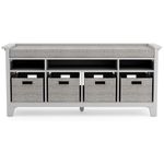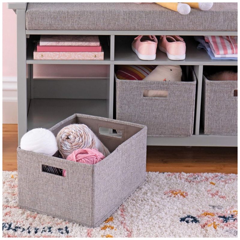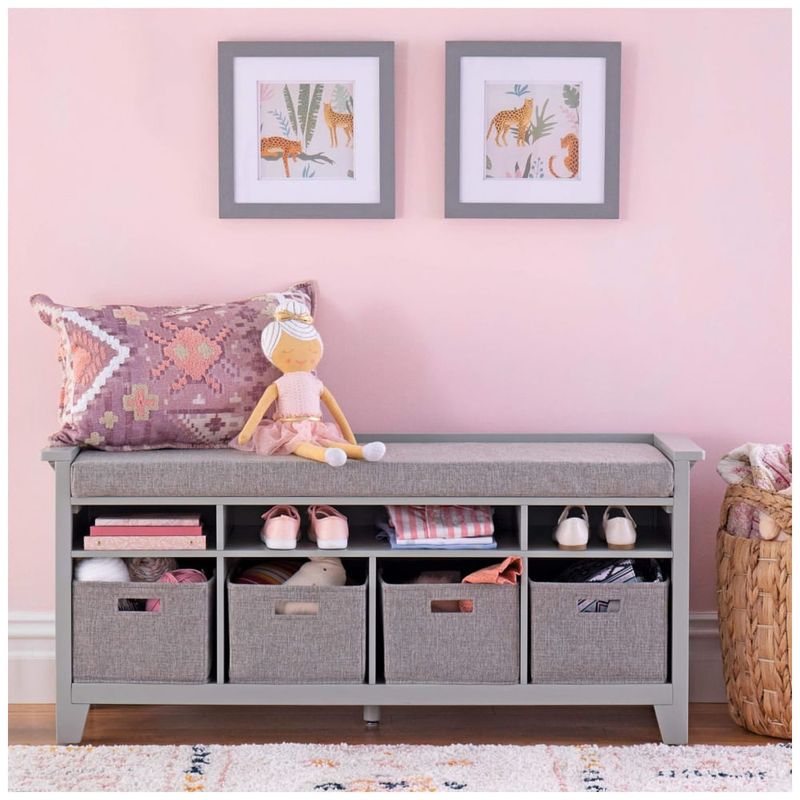 O Martha Stewart Kids’ Storage Bench em cinza foi desenvolvido como banco infantil multifuncional para organizar brinquedos, livros e acessórios em quartos, halls de entrada e brinquedotecas, oferecendo ao mesmo tempo um assento confortável para crianças. A peça reúne prateleiras abertas frontais e laterais com 4 cestos de tecido inclusos, permitindo separar itens por categoria e manter o ambiente visualmente organizado.?