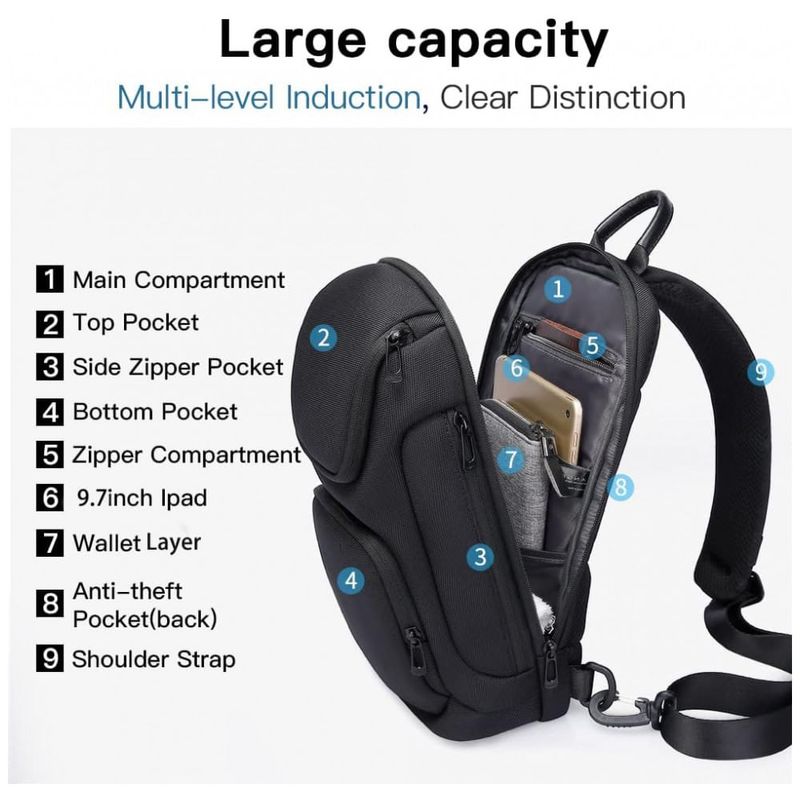 MOCHILA SLING DE GRANDE CAPACIDADE O bolso lateral frontal é conveniente para vários itens pequenos. Compartimento grande com bolsos internos é ótimo para ipad, câmera, banco de potência, garrafa de água, notebook, canetas. Bolso exclusivo para cartões na alça de ombro torna esta bolsa de peito pensativa.