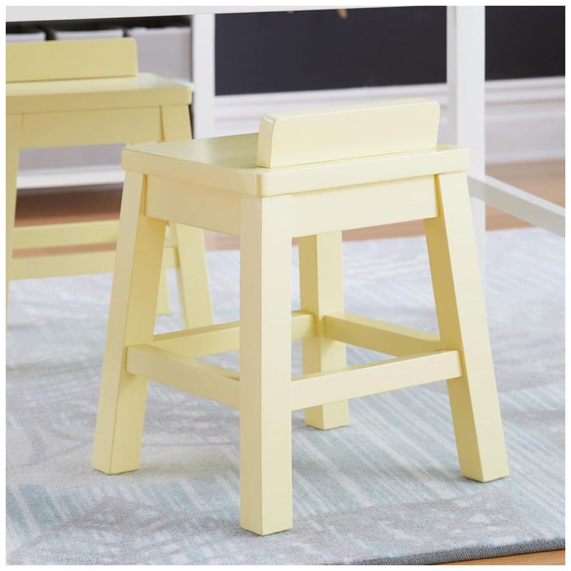 O conjunto Martha Stewart Crafting Kids’ Stools Set of 2 em amarelo pastel foi desenvolvido como par de banquinhos infantis para uso com mesas de arte, mesas de atividades e escrivaninhas infantis. Cada banco possui pernas levemente afuniladas e encosto baixo integrado, solução que ajuda a reduzir o risco de tombamento lateral e oferece apoio adicional às costas da criança durante o uso.?