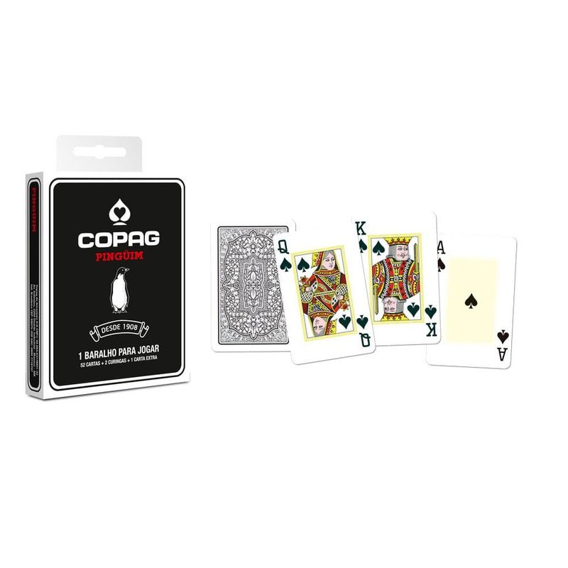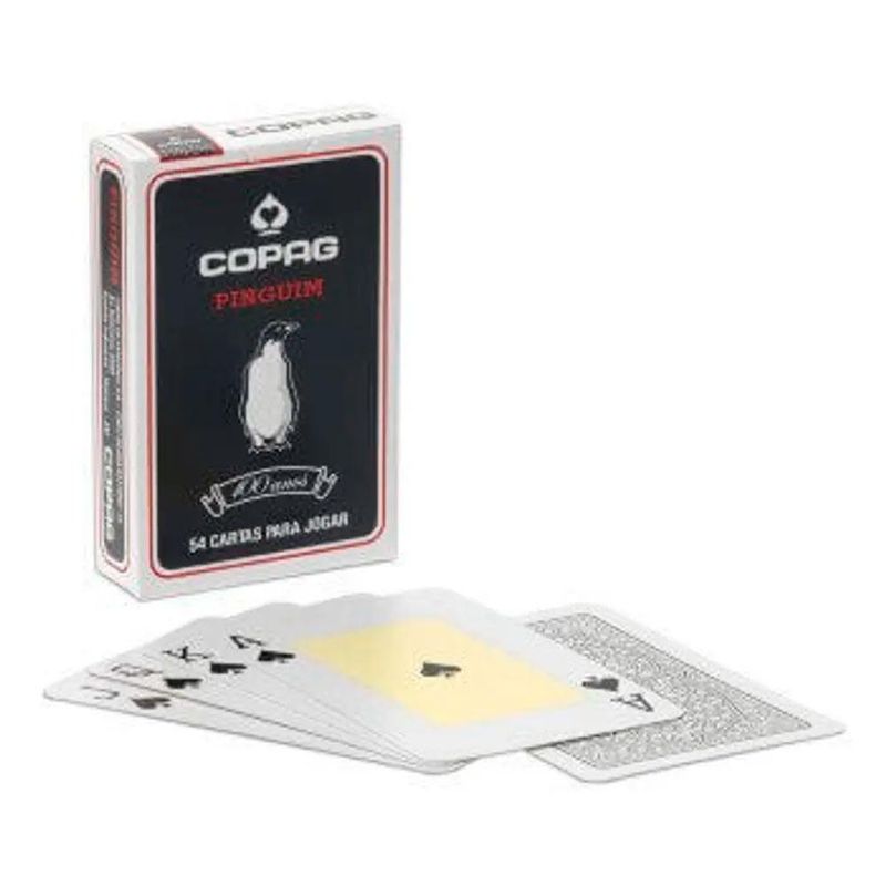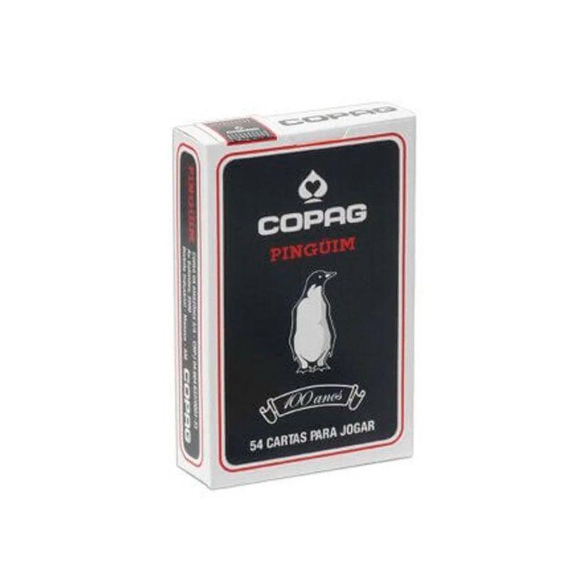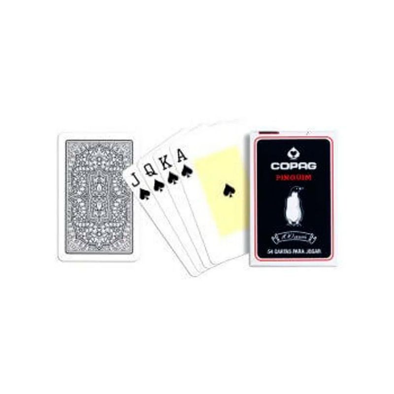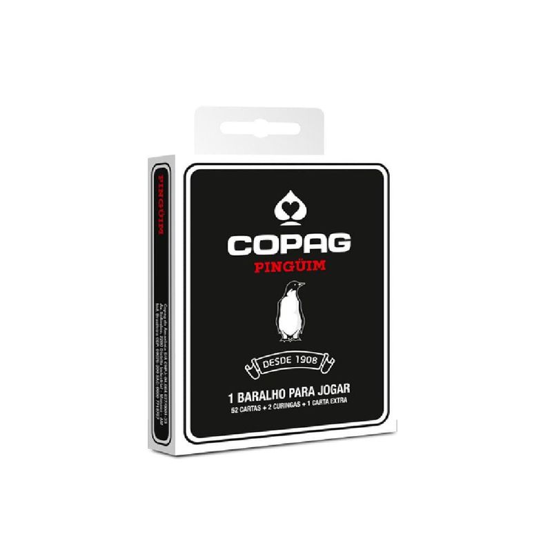 Baralho Copag Pinguim Preto Cartucho Unitário - Copag Tipo da carta: cartão couché 305 g Tamanho da carta: Bridge Size 57x89 mm Quantidade de cartas: 55 cartas (52 cartas + 2 curingas + carta garantia) Tipo de embalagem: caixa unitária Embalagem: Unitário Material: Cartão Ocasião de Jogo: Para Churrasco, Para Presente Quantidade de Pessoas: 2 ou mais, 3 ou mais, 4 ou mais Tamanho da carta: Bridge Size Tamanho do Naipe: Convencional Tipo de Jogo: Buraco, Paciência, Tranca, Truco Produto de alta qualidade. Não transparente, atóxico e reciclável. Cartão Couché com alta rigidez. Fácil deslize e agradável manuseio.