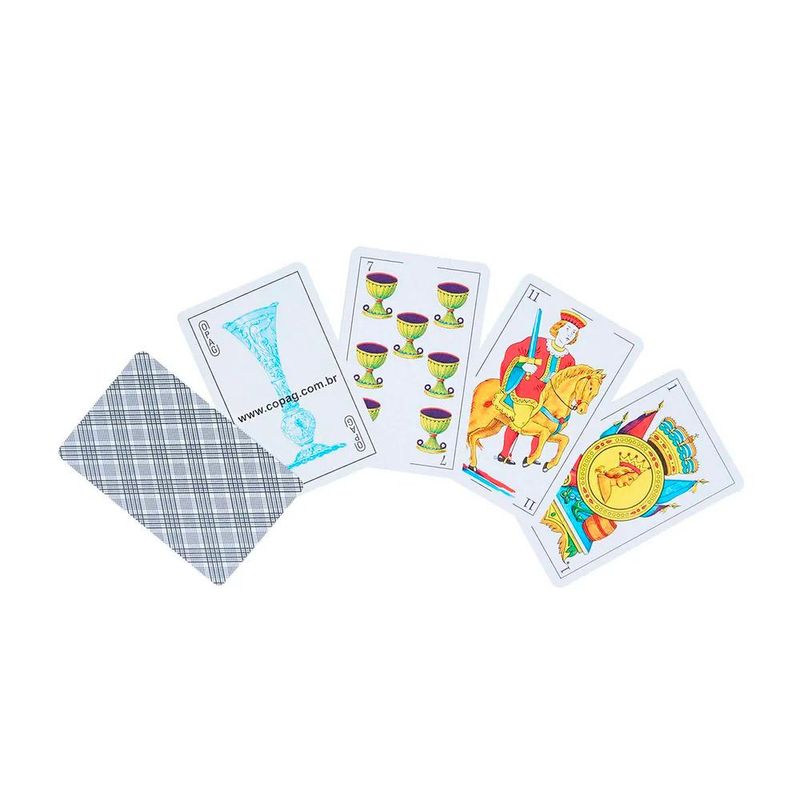 Baralho Espanhol Azul - Copag Tipo da carta: cartão couché Tamanho da carta: Bridge Size (57x89mm) Quantidade de cartas: 50 cartas cada (48 cartas + curinga + carta garantia) Tipo do naipe: naipe espanhol Tipo de embalagem: caixa unitária Produto de qualidade. Não transparente, atóxico e reciclável. Cartão laminado permitindo um agradável manuseio. Embalagem Unitário Material Cartão Ocasião de Jogo: Para Churrasco, Para Presente Quantidade de Pessoas: 2 ou mais, 3 ou mais, 4 ou mais Tamanho da carta: Bridge Size Tamanho do Naipe: Convencional Tipo de Jogo: Buraco, Paciência, Tranca, Truco