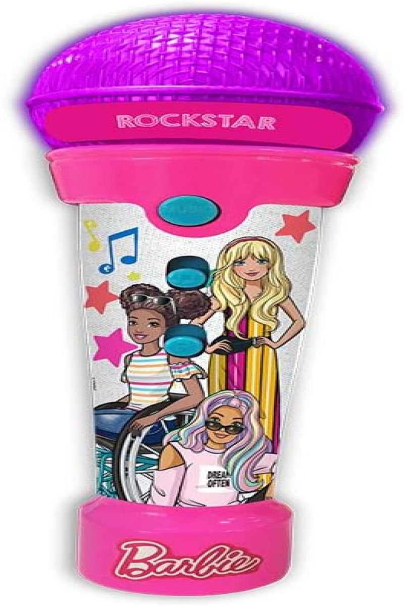 Sempre incrível! O novo microfone da Barbie com MP3 possibilita realizar uma grande performance onde quer que você esteja. Conecte seu celular ou MP3, com o cabo, para tocar suas músicas preferidas e cante junto sem perder o tom. Sua voz e a música soaram pela pequena saída de som que fica na base do microfone. O show fica ainda mais completo com as coloridas luzes de LED que brilham em seu bocal. Funciona com 3 pilhas AAA (não inclusas). Recomendação: 3+