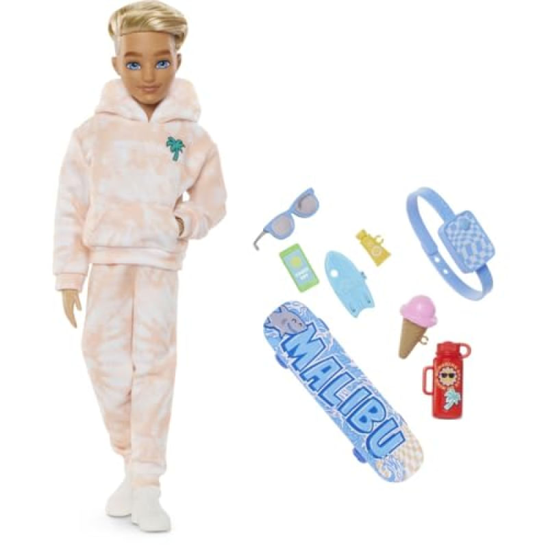 Inclui 1 Ken Dream Besties™ vestindo um moletom, calças de moletom e tênis, 1 par de óculos de sol, 1 telefone, 1 protetor solar, 1 skate, 1 pochete, 1 garrafa de água, 1 capa de telefone em formato de prancha de surfe e 1 casquinha de sorvete.O boneco não fica em pé sozinho. As cores e decorações podem variar.