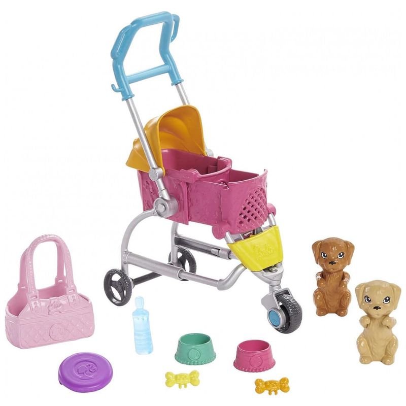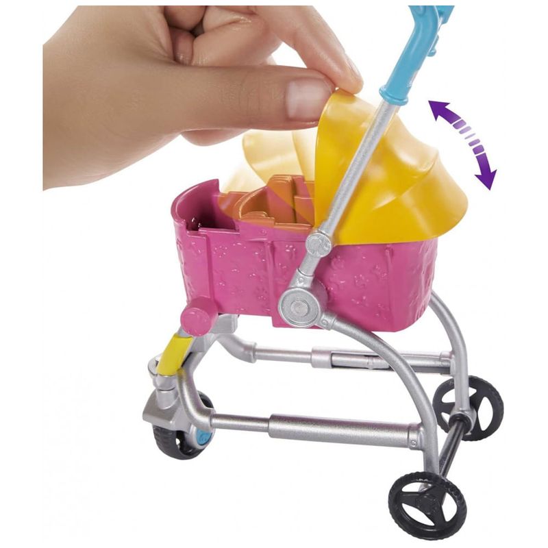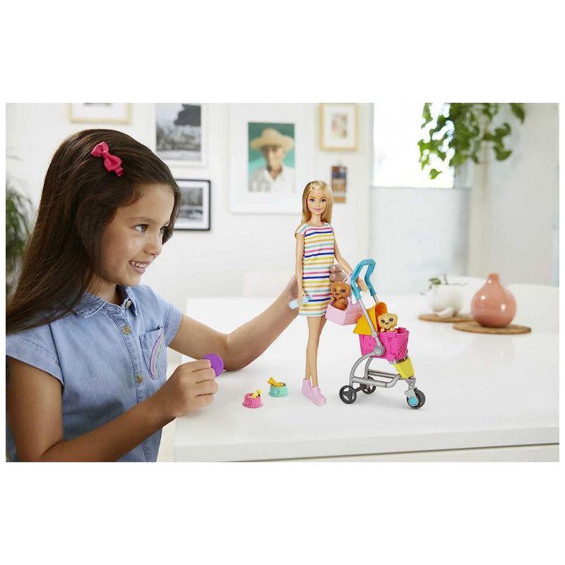 Jogue o dia perfeito para brincar de filhote com o playset Barbie Stroll n Play Pups que inclui uma boneca Barbie, dois filhotes de estimação, um carrinho de bebê transformador e acessórios para contar histórias