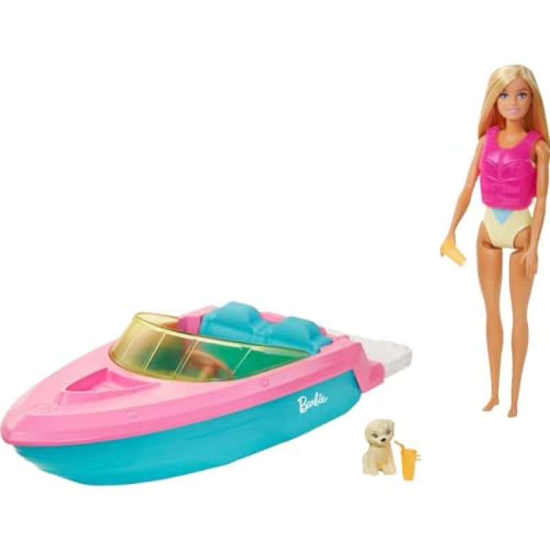 As imaginações podem levar suas histórias da terra ao mar com a boneca Barbie, seu cachorrinho de estimação e um barco que flutua na água. Com recursos bacanas, design colorido e espaço para três bonecos (outros bonecos vendidos separadamente), as crianças podem carregar a lancha e levá-la em todos os tipos de aventuras. Coloque a boneca Barbie no colete salva-vidas rosa choque e ande pelas ondas, depois estacione o barco no lounge com porta-copos plug-and-play e acessórios para bebidas.