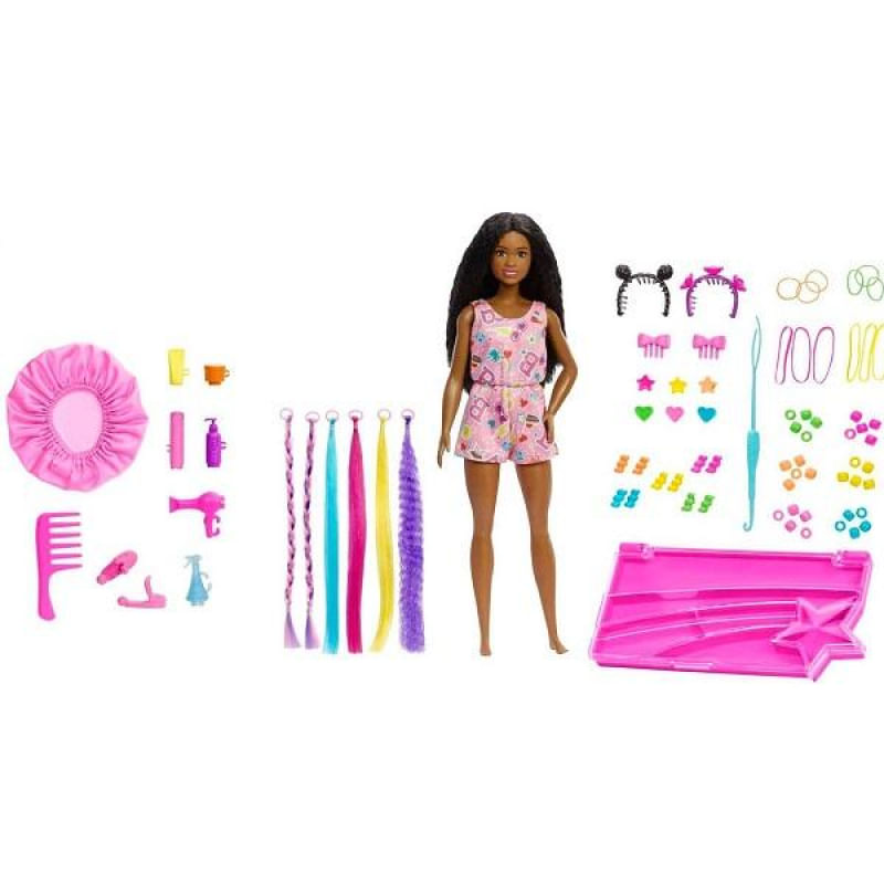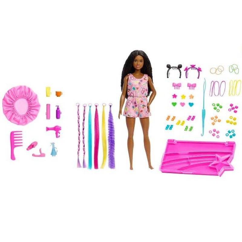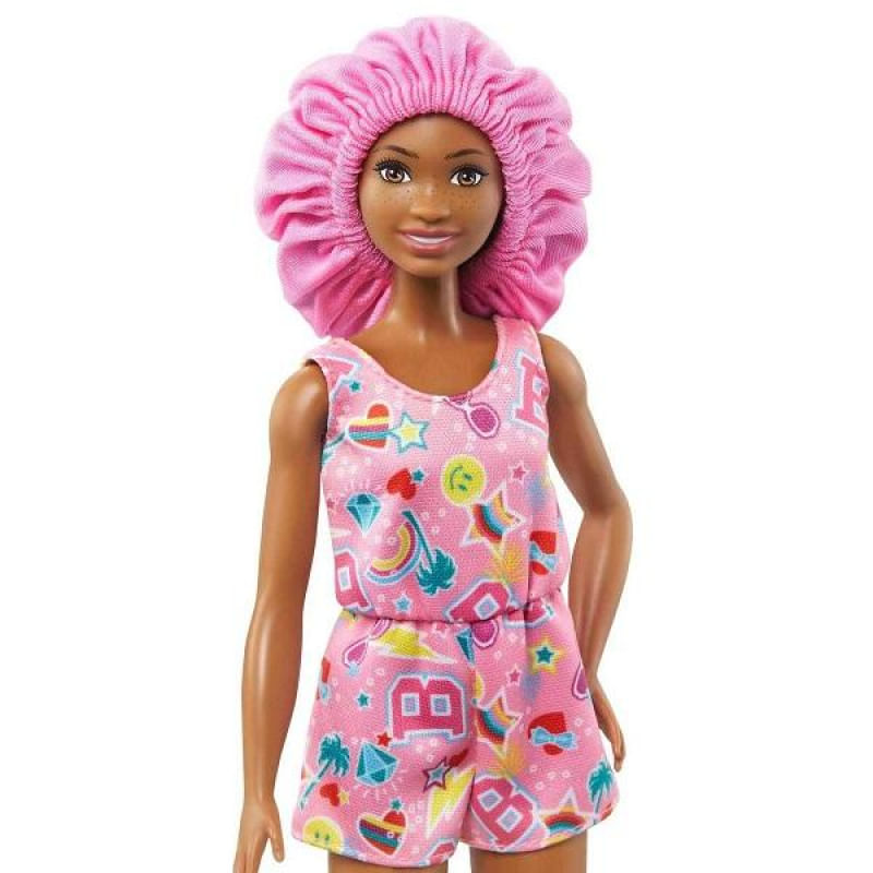 Jogue a rotina da boneca Barbie do início ao fim com um gorro, pente e seis peças para o cabelo, uma com cheiro de coco.
