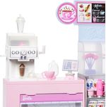 A boneca Barbie utiliza um avental para atender os clientes na caixa registradora. Contém mais de 12 peças para contar histórias, algumas das quais se prendem às mãos da Barbie. A boneca não fica em pé sozinha. As cores e as decorações podem variar.