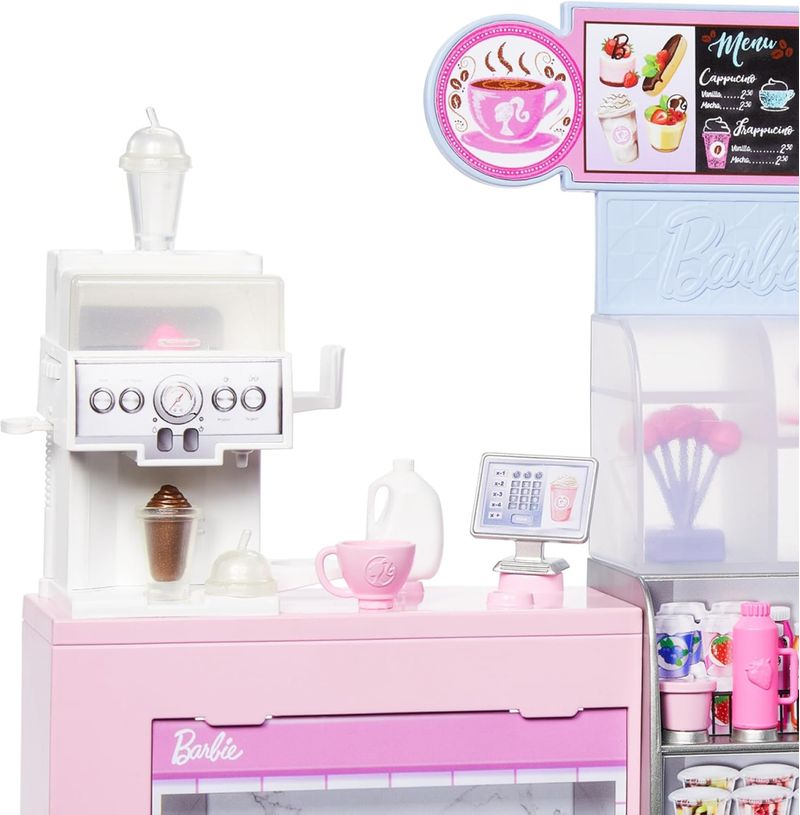 As crianças podem soltar a imaginação com a boneca Barbie Profissões e seu divertido Conjunto de Brinquedo Cafeteria. Com diversos sabores de café/smoothie no balcão da cafeteria para preparar, basta girar o botão da máquina para escolher. Também há chá e snacks no menu. Os acessórios adicionais incluem um jarro de leite, xícaras de café, canecas de smoothie, uma xícara de chá e muito mais.