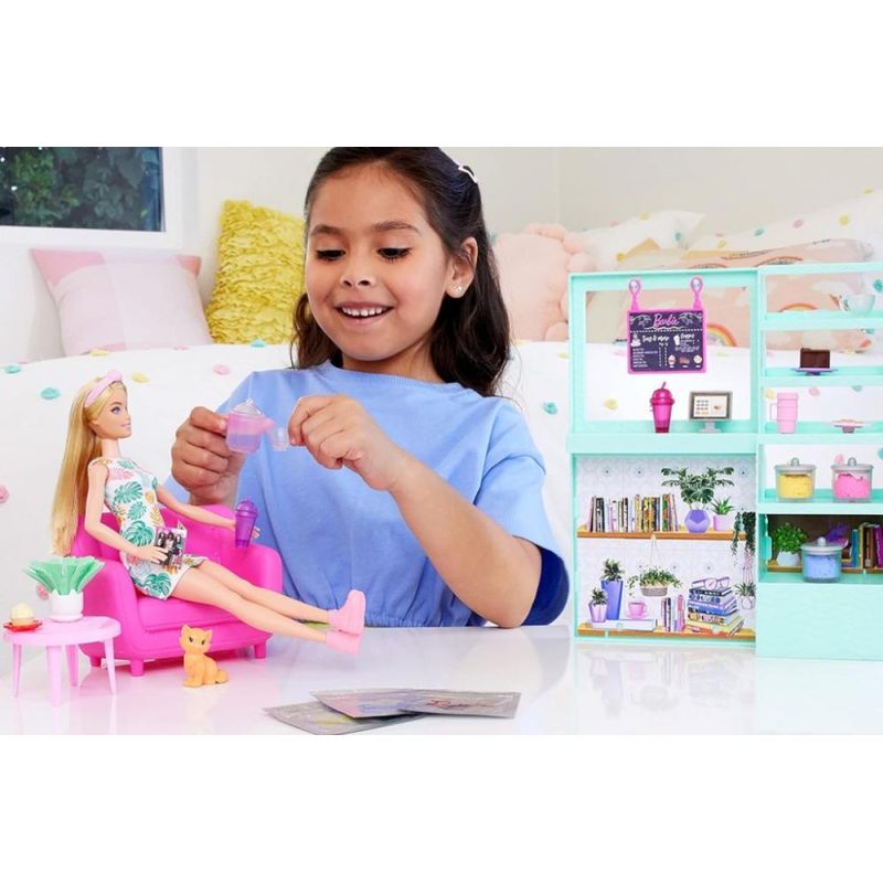 Desfrute de um momento relaxante no Cute n Cozy Café com este conjunto de Barbie e loja Decore o balcão e as prateleiras com acessórios, pegue uma guloseima e, em seguida, finja preparar uma infusão de ervas no bule que muda de cor. Com 21 peças para contar histórias, incluindo um gatinho de estimação, este conjunto encantador vai render horas de diversão sem fim A boneca não fica em pé sozinha. As cores e as decorações podem variar. Não coma nem beba o conteúdo. Idade recomendada: 5; Composição/Material: Plástico; Funciona com pilhas: Não ; Brinquedo com luz: Não ; Brinquedo com som: Não ; Dimensões: 9x33x34 cm; Peso: 1,18 kg; Código de Barras: 0194735108251; Garantia do Fornecedor: 3 Meses contra defeito de fabricação;