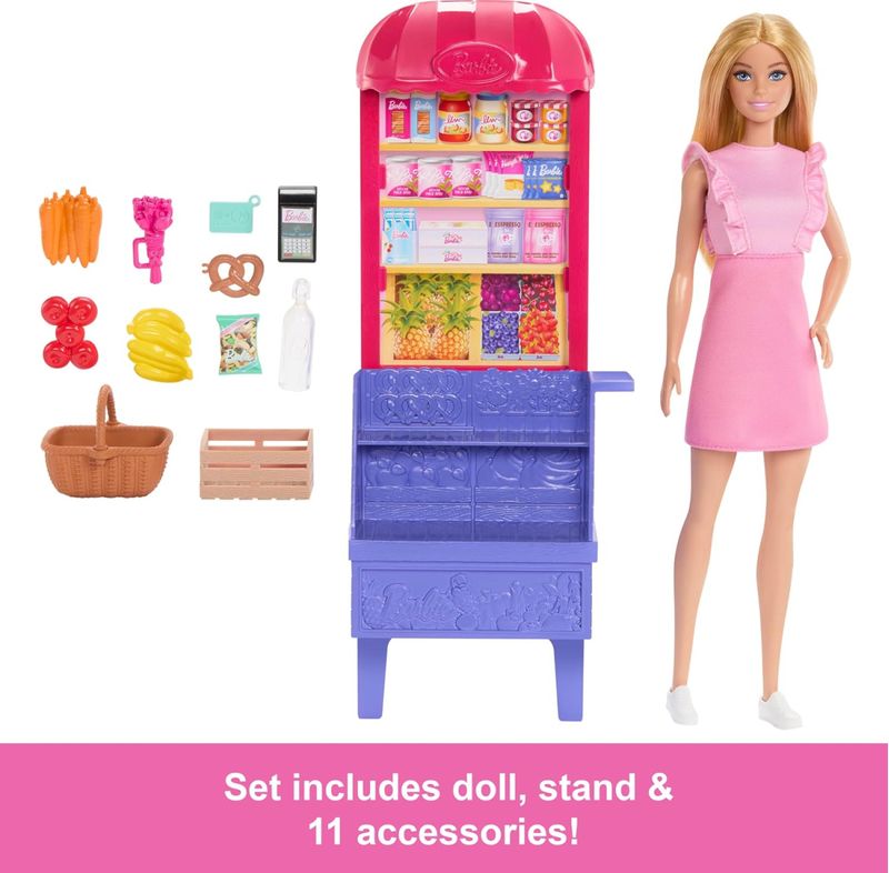 A Imaginação Pode Criar Todos Os Tipos de Histórias com a Boneca e Conjunto Malibu No Mercado. Inspirado No Filme Barbie e Teresa: Receita da Amizade, o Conjunto com Tema de Comida Permite Que As Crianças Decidam o Que Vai Servir No Cardápio. a Barraca do Mercado Tem Um Design Colorido e Prateleiras para Expor Comidas e Bebidas. Onze Acessórios Temáticos Incluem Uma Cesta de Compras, Uma Caixa Registradora de Produtos e Um Leitor de Cartões para Uma Brincadeira Realista. a Boneca Barbie "malibu" Usa Uma Linda Roupa Rosa e Tênis para Sua Ida à Loja.