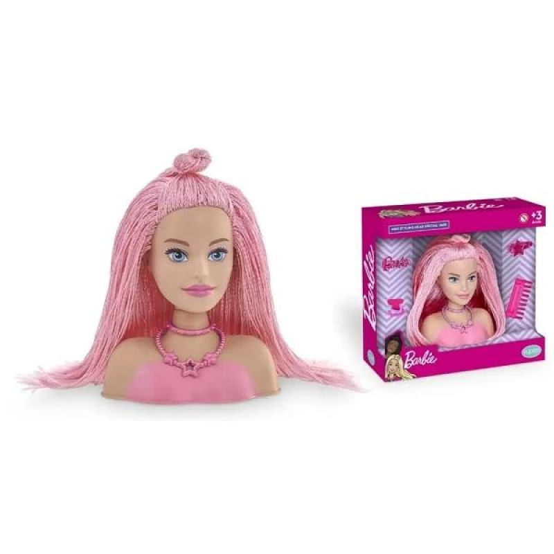 A última linha de bonecas Barbie Mini Styling Head Special Hair inclui 01 Boneca Barbie, 01 Pente para Cabelo, 01 Presilha Estrela, 01 Presilha Logo Barbie e 10 Elásticos de Silicone.