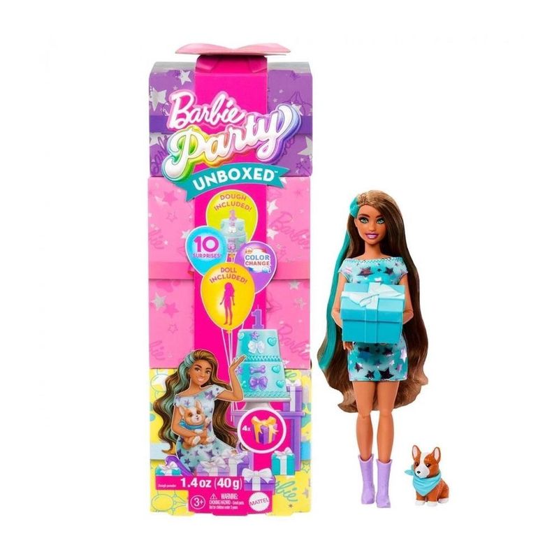 Com 10 surpresas em um pacote, as bonecas Barbie Party Unboxed oferecem uma experiência única de unboxing com embalagens inspiradas em caixas de presente e diversão com tema de aniversário de bichinhos de estimação Há três bonecas para colecionar: Birthday Bows, Shimmerin Hearts ou Party Stars. Qual boneca você vai revelar Continue desembrulhando os presentes para encontrar roupas de festa, um bichinho de estimação adorável com acessórios para vestir e ferramentas para decorar bolos. Os jovens criativos podem usar o composto de massa fácil de misturar e fazer, a bandeja de moldes e as ferramentas para fazer decorações para o bolo de aniversário de dois andares incluído e dar uma festa de aniversário de bichinho de estimação. Mais surpresas incluem mudança de cor no rosto da boneca e no bichinho de estimação - basta usar água gelada e morna para transformar, mudar de volta e repetir várias vezes As crianças vão adorar descobrir a festa dentro desta série Barbie Party Unboxed Pet Birthday e podem colecionar todas para manter as surpresas da festa Cada boneca é vendida separadamente, sujeita à disponibilidade. As bonecas não ficam sozinhas. As cores e decorações podem variar.\n\nIdade recomendada:2-4 anos;Composição/Material:Plástico;Funciona com pilhas:Não;Brinquedo com luz:Não;Brinquedo com som:Não;Dimensões:32,7x11x9 cm;Peso:558 kg;Código de Barras:194735296545;Garantia do Fornecedor:3 Meses contra defeito de fabricação;