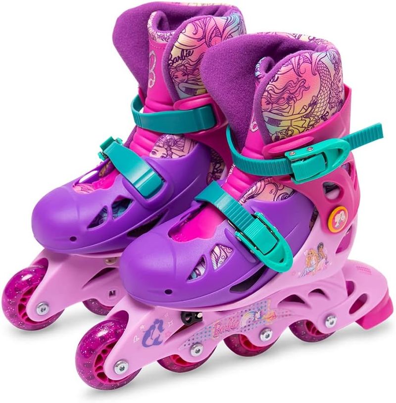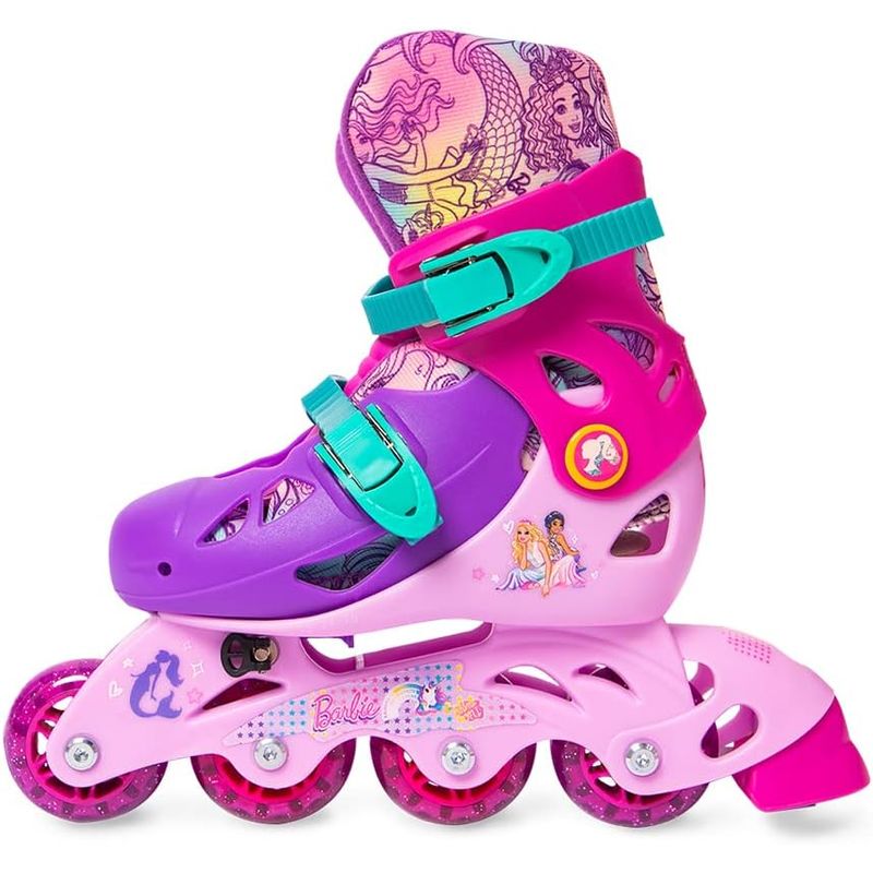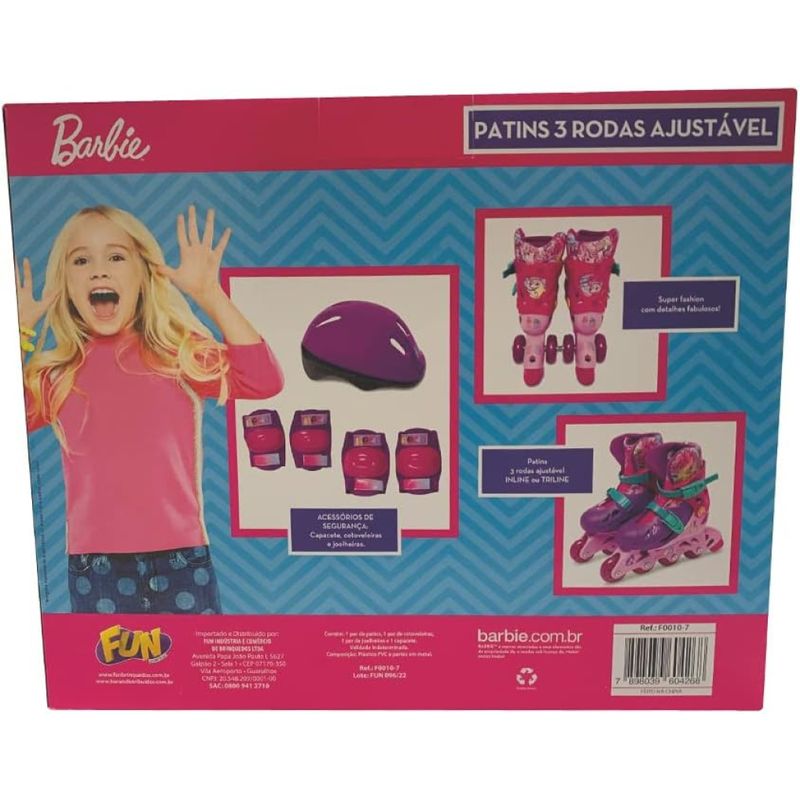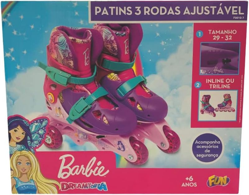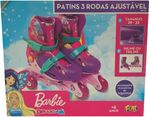 BARBIE PATINS 3 RODAS AJUSTÁVEL 29 A 32 C ACESSORIOS DE SEGURANÇA Para quem já é fã da linha de brinquedos Barbie, olha só o que a Fun trouxe com exclusividade. Esse patins cor de rosa, decorados com o charme e a marca Barbie, é tudo o que as meninas querem para passear com bastante estilo. Mas o Patins Fashion da Barbie 3 rodas não é só beleza, não. É de boa qualidade também. Feito em PVC, um material bastante resistente, seu interior está equipado com um bota acolchoada muito confortável. Ele é todo afivelado, permitindo um encaixe perfeito nos pés. E mais, ele cresce com a criança, sendo perfeitamente ajustável para cada variação de tamanho. E depois que a criança aprender bem a andar, é só transformar o patins de 3 para 4 rodas in line Além disso, este patins vem com dispositivo que permite 4 ajustes de tamanho (tamanhos 29, 30, 31 e 32). E olha que legal: o patins já vem com itens de segurança: capacete, cotoveleira e joelheira (acessórios não profissionais). E também uma cartela de Strass. As fotos são ilustrativas. Tonalidades das cores podem variar. Conteúdo da embalagem: 01 Patins Barbie, da Fun, cor de rosa, 3 rodas, ajustável para os números 29 ao 32 01 Capacete 01 Cotoveleira 01 Joelheira 01 Roda extra (para converter o patins de 3 para 4 rodas inline) 02 Chaves Allen 04 Parafusos e porcas 01 Cartela de Strass para decorar o patins Manual de Instruções na caixa do patins Características: Idade Recomendada: A partir de 3 anos Cor Predominante: Rosa Personagem: Barbie Tamanho Ajustável: Para os tamanhos 29 ao 32 Material: PVC, poliéster e alumínio Rodas Material: Emborrachado Garantia: 3 meses
