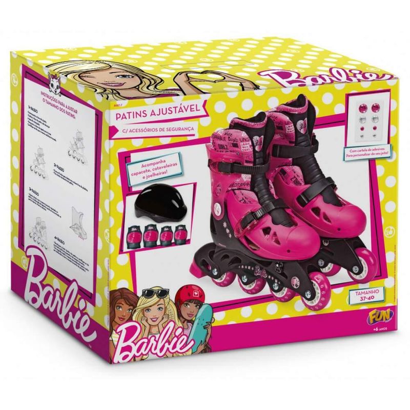 Dicas de Uso:Para garantir a durabilidade do produto, é importante utilizar os acessórios de segurança fornecidos e ajustar corretamente o tamanho do patins conforme o crescimento dos pés da criança. Incentive a prática esportiva ao ar livre.Ficha Técnica:Marca: Fun Divirta-se;Nome do produto: Barbie Patins Ajustável G2 Tam 37 ao 40;Idade recomendada: A partir de 6 anos;Selo Inmetro: 009569/2022;Contém: 1 patins Ajustável 37 40, com acessórios de segurança e cartela de strass.