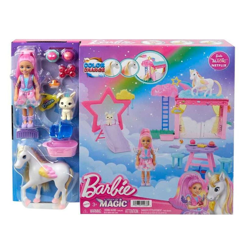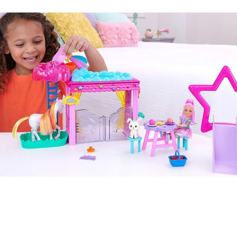 Contém: 1 boneca Chelsea, 1 Pegasus da Barbie, 1 coelho unicórnio, 1 estábulo, 1 escorregador, 1 mesa com duas cadeiras, 1 pente e diversos acessórios. A boneca não fica em pé sozinha. As cores e as decorações podem variar.