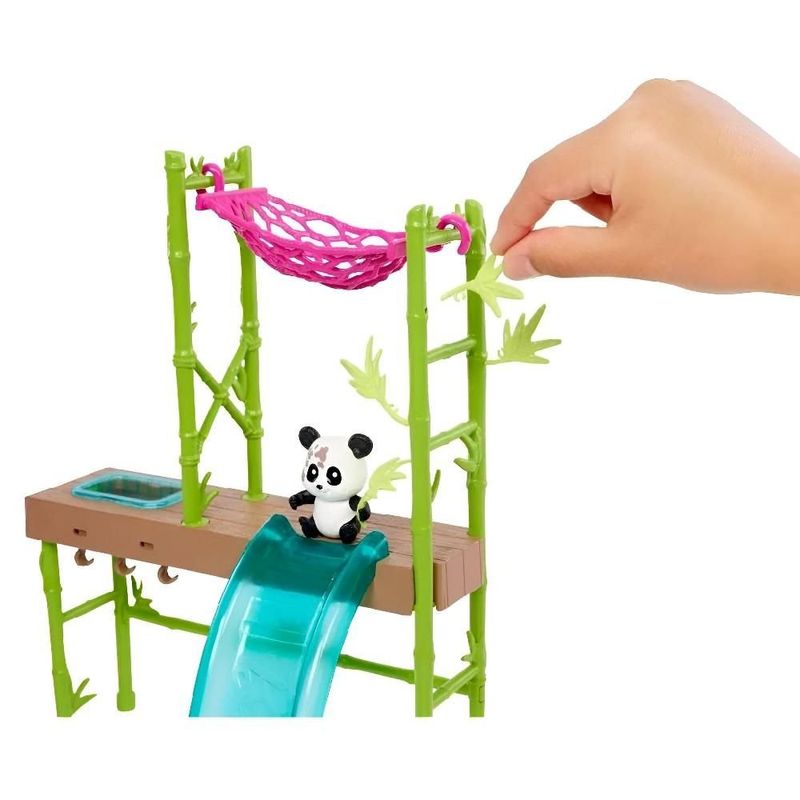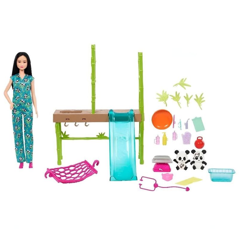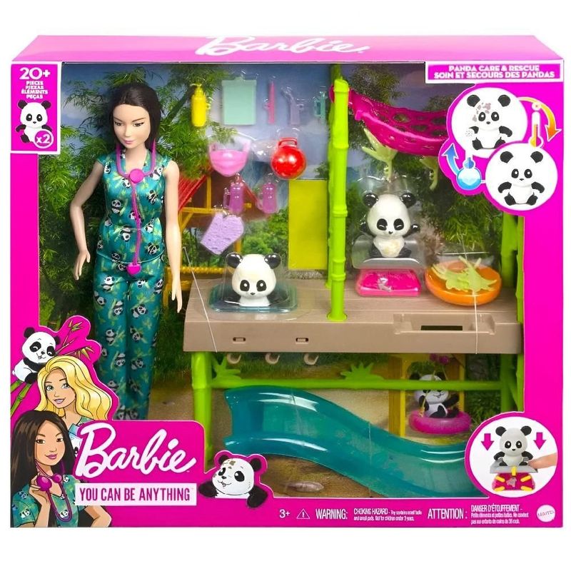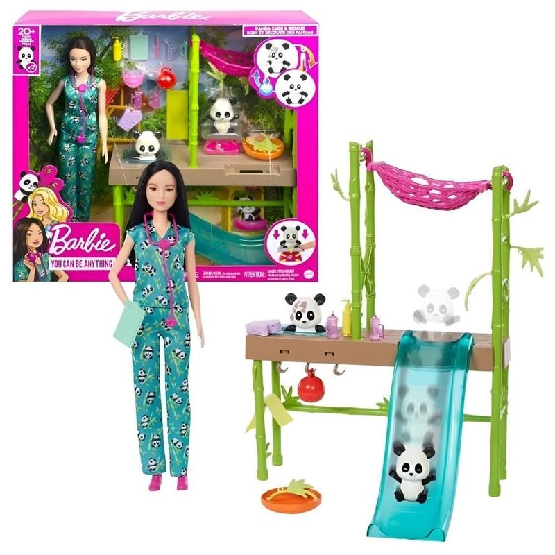 O conjunto Barbie Cuidados e Resgate de Pandas permite que as crianças explorem seu lado aventureiro e carinhoso com uma Barbie veterinária dedicada ao resgate de pandas! Com dois bebê panda ambos com transformação da cor e mais de 20 acessórios temáticos, este conjunto de profissões inspira imaginações. Três áreas de lazer, incluindo uma estação de limpeza e cuidados, escorregador e rede ajudam a cuidar de todas as necessidades do paciente panda.