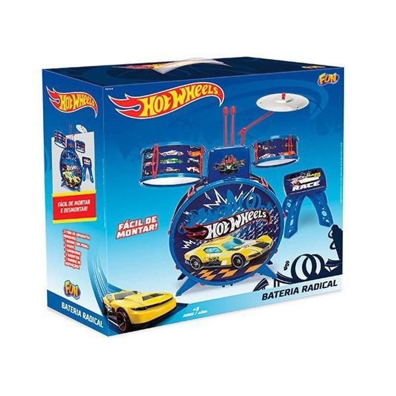 Bateria Infantil Hot Wheels! Chegou a verdadeira Bateria Radical para você brincar e se divertir. Vem com 3 tambores de tamanhos diferentes, pequeno, médio e grande, além de prato, baquetas e um banquinho. A Bateria Infantil Hot Wheels é igualzinha a uma bateria de verdade e é muito fácil de montar. Divirta-se e também chame seus amigos para curtir um som. Entre nessa!