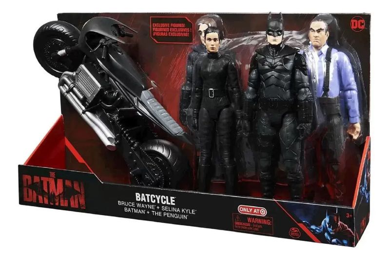 Cabe no Batciclo, figura de ação de 30 cm e vem com 4 figuras de 30 cm dos personagens: Pinguin, Batman, Mulher Gato e Bruce Wayne. Dirija o Batciclo e proteja Ghotam City!