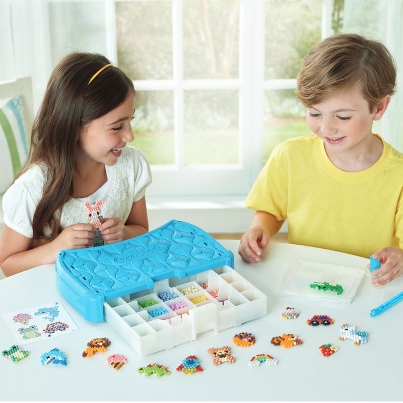 O Beginners Craft Studio para Iniciantes inclui 900 miçangas em 2 cores, Estojo de transporte com Paleta de miçangas, Bandeja pop-up, caneta Aquabeads, pulverizador, tela para criações, pinos de design, 2 Coleções de modelos, folha de modelo e instruções. Seguindo a folha de modelo, coloque as miçangas na bandeja para criar coelho, golfinho, arco-íris, sorvete e muito mais. Usando o pulverizador, borrife água nas miçangas para fazê-las grudar magicamente! Inclui 900 miçangas clássicas, em formato de joia, polígono e de estrela em 25 cores, incluindo as novas “Miçangas de Aquarela”, estojo de transporte com paleta de miçangas, Bandeja pop-up, caneta Aquabeads, pulverizador, 4 pinos de design, 2 coleções de modelos, folha de modelo e instruções. Para crianças a partir de 4 anos.
