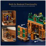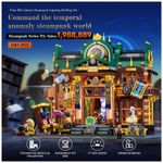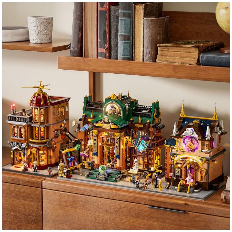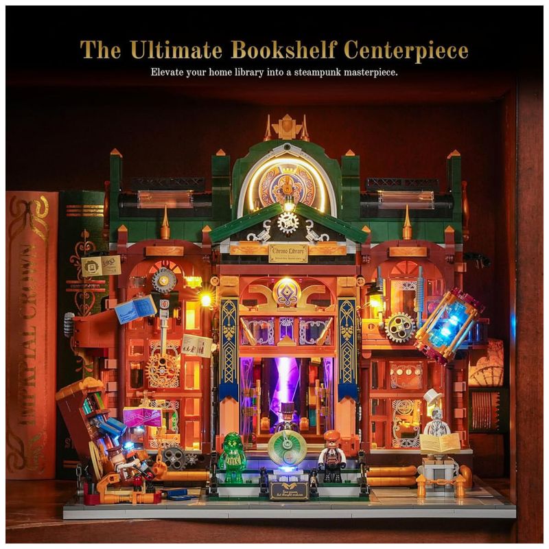 O kit Lumibricks Biblioteca Fenda Temporal Steampunk contém 3187 peças plásticas ABS que recriam fachada vitoriana clássica com grande janela de vidro, integrando sistema de iluminação com 17 LEDs individuais: lâmpadas de gás quentes, pulso frio da fenda temporal e luz roxa mística na entrada, criando efeitos narrativos de energia arcana em camadas.