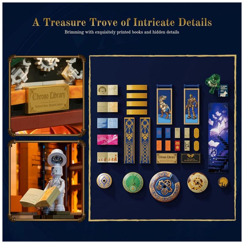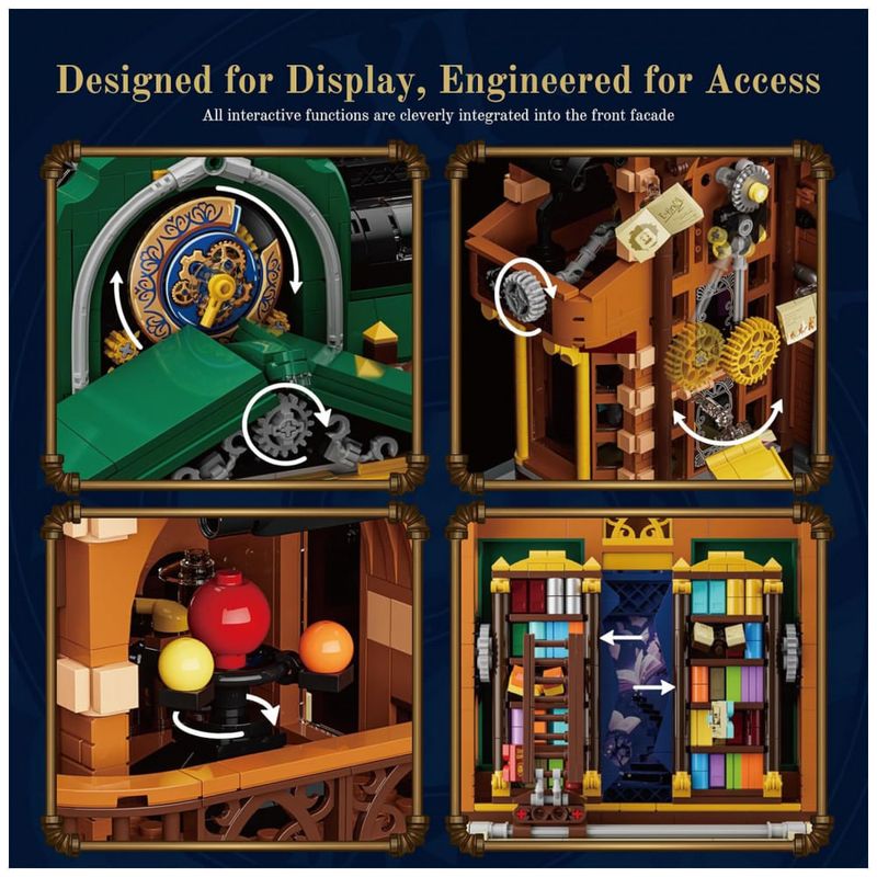 O elemento central é a fenda temporal iluminada que simula ruptura da realidade com livros projetados das prateleiras, combinando arquitetura histórica com fantasia luminosa. A estrutura de 33 cm de altura otimiza exibição em prateleiras, com design de acesso frontal inteligente para operação de cinco características interativas: globo celeste giratório, porta frontal abrindo, entre outras.
