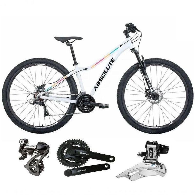 Bike aro 29, com quadro Absolute Mia 3, nova na caixa a pronta , produto com ótima qualidade e acabamento, possui 24 marchas com sistema de alavancas rapid fire que a cada clique uma marcha é trocada, câmbio dianteiro shimano altus e traseiro shimano altus, garfo com suspensão e sistema de trava para melhor performance, sistema de freio a disco hidráulico, pneus com cravo baixo para uso em terra e asfalto. Bicicleta pré montada, vai precisar apenas fixar a roda dianteira, guidão, selim e pedais. Seguem abaixo características da bike:Cor: ;Branco ;