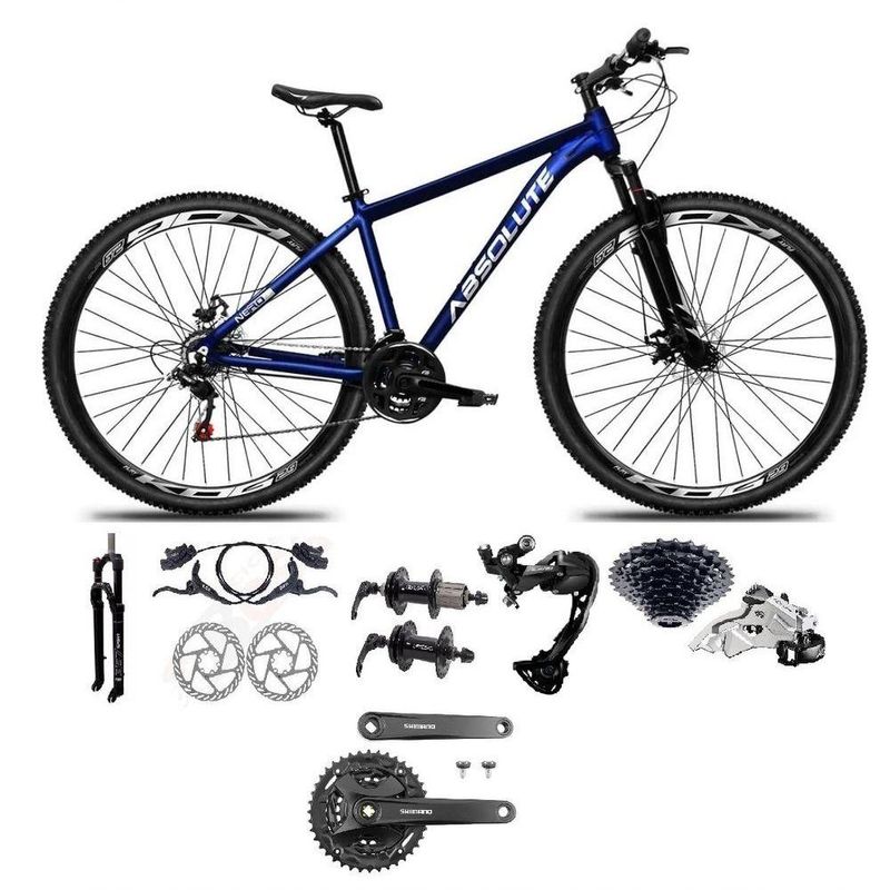 Bike aro 29, com quadro Absolute Nero 5, nova na caixa a pronta entrega, produto com ótima qualidade e acabamento, possui 27 marchas com sistema de alavancas rapid fire que a cada clique uma marcha é trocada, câmbio dianteiro shimano altus e traseiro shimano alívio M3100 sgs, garfo com suspensão e sistema de trava para melhor performance, sistema de freio a disco hidráulico, pneus com cravo baixo para uso em terra e asfalto. Bicicleta pré montada, vai precisar apenas fixar a roda dianteira, guidão, selim e pedais. Segue abaixo características da bike: Quadro 29 Absolute Nero 5 em Alumínio / Garfo 29 suspensão com Trava no Ombro e regulagem / Suporte do guidão em alumínio preto / Guidão 31.8mm em alumínio preto / Canote do selim 27.2 em alumínio preto Com carrinho / Selim Sport Preto / Abraçadeira do Selim alumínio Preto / Aros Aero Parede dupla reforçado / Raios Pretos / Cubos em Alumínio Pretos com blocagens / Pneus 29 com cravo / Movimento central selado rolamentado / Freios a disco Hidráulicos com discos inox 160mm / Alavancas Semi-automáticas Rapid Fire gta/sunrun / Câmbio Traseiro shimano alívio M3100 sgs 27V / Câmbio Dianteiro shimano altus 9v / Corrente Index dto/paco / Pedivela shimano Mt101 ou M371 27v(DEPENDERÁ da disponibilidade no estoque) / Pedal Plataforma Nylon preto / Cassete k7 gta Sunrun 11/32 cromada.