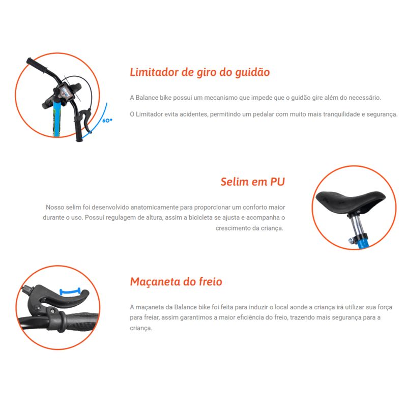 A bicicleta Balance Nathor conta com limitador de giro do guidão (garantindo mais segurança).