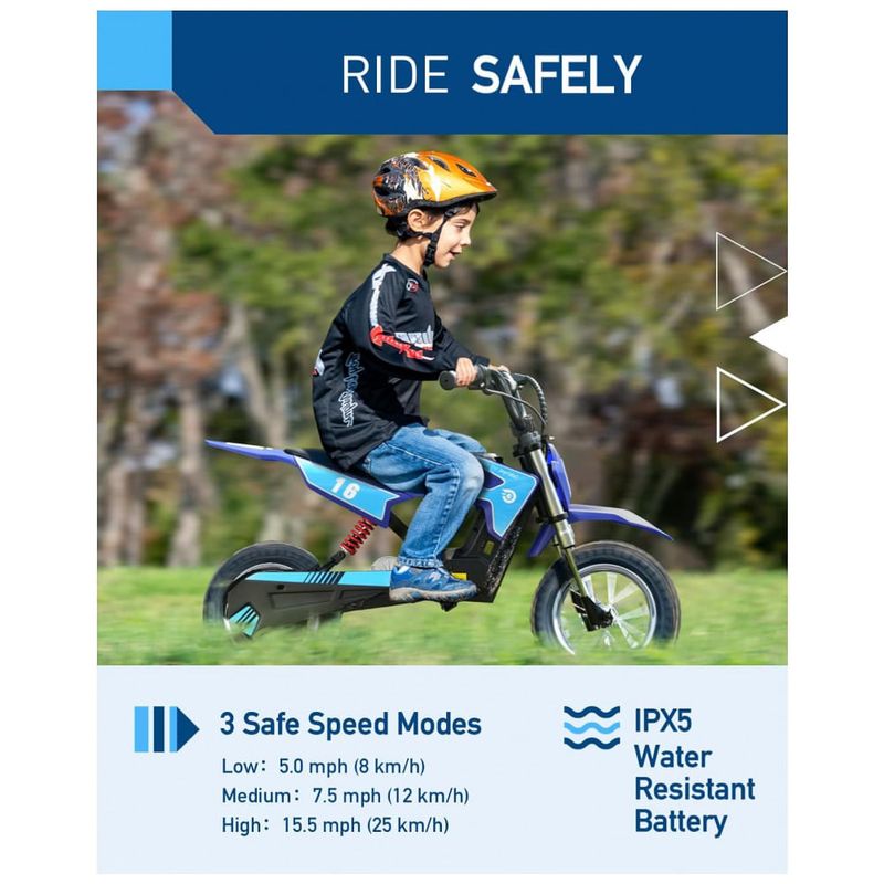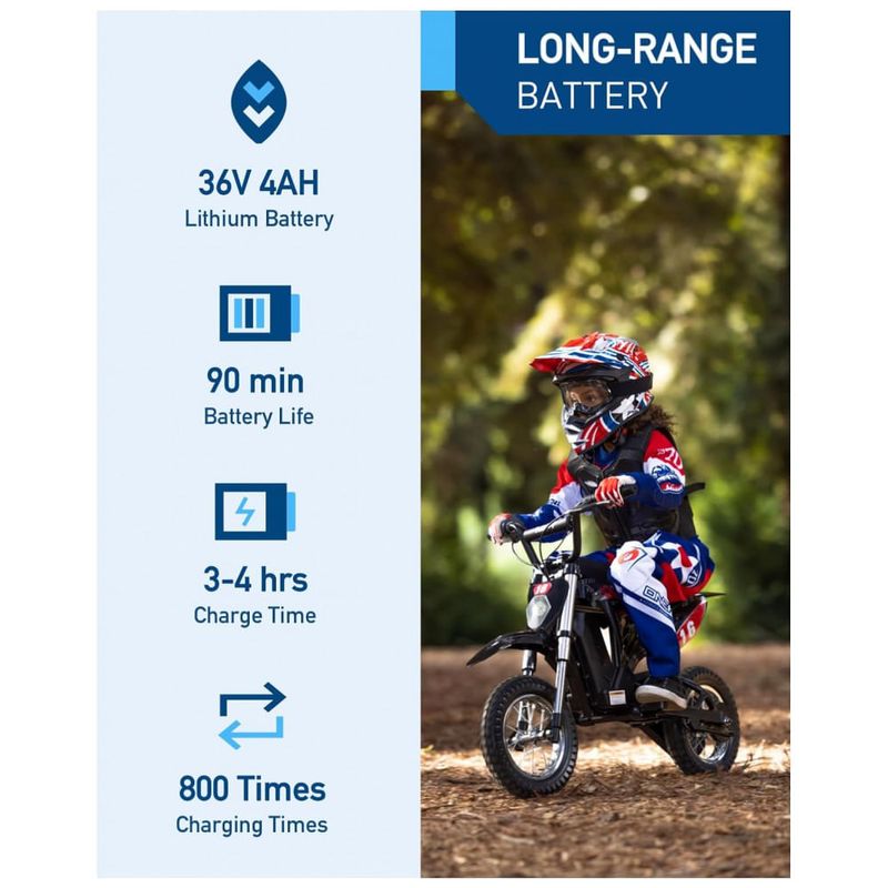 DURÁVEL FORTE Motocicleta elétrica projetada para crianças de 313 anos com geometria autêntica de bicicleta da sujeira proporciona um passeio sólido offroad com um peso máximo do piloto de 63,49 quilos.