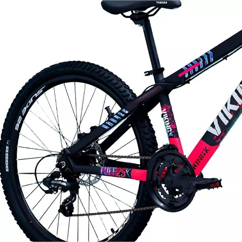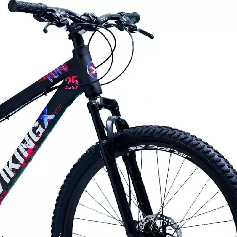 - Foto Meramente Ilustrativa ;- Marca: VikingX- Quadro Alumínio- Idade recomendada: Juvenil/Adulto- Gênero: Unissex- Aro: 26- Velocidades 21 Marchas- Garfo: Suspensão Mecânica- Guidão: Aço carbono Mtb- Freios: Disco Mecânico- Rodas: Aero Conforme disponibilidade de estoque ;- Câmbios: Importados- Manoplas: Mtb Simples ;- Corrente: Index- Selim: Mtb Simples ;- Trocador: Rapid fire importado- Pedivela: Importado- Pneus: Mtb com cravo ;- Pedal: Plástico Mtb- Modelo da bicicleta: Mtb ;OBSERVAÇÕESPode haver alguma diferença de tonalidade entre a imagem e o produto real, por conta do tratamento de imagens e a calibração de cores do monitor.MONTAGEMEnviamos a bicicleta pré-montada, revisada e devidamente embalada, para melhor se acomodar na embalagem de transporte são retirados apenas: selim, pedais, guidão e roda dianteira.O custo da montagem é de responsabilidade do cliente.Por motivo de transporte e manuseio, é necessário efetuar uma nova regulagem de câmbio ao receber o produto.Não nos responsabilizamos pela revisão final da bicicleta, sugerimos que seja efetuada por uma oficina especializada.GARANTIANÃO COBRE DEFEITOS POR MAU USO OU PELA MONTAGEM, REGULAGEM DE CÂMBIOS OU REVISÃO INADEQUADA DO PRODUTO.A garantia será validada para as bicicletas montadas e revisadas por uma oficina especializada e é referente apenas ao primeiro proprietário.A garantia não se aplica para os itens de desgaste natural, tais como: Pneu, câmaras, cabos, sapatas ou pastilhas de freio, centragem de aros, pintura do quadro, componentes da transmissão (câmbios, corrente, engrenagens do pé de vela, engrenagens do cassete). ;