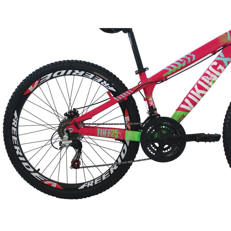 Bicicleta X TUFF25 Freeride Aro 26 Freio a Disco 21 Velocidades Cambios Shimano Rosa Verde VikingFoi projetada para quem quer uma bike de personalidade e estilo inigualável. Ela oferece ao ciclista quadro diferenciado e design arrojado e exclusivo. Com qualidade, ela vem equipada de com 21 velocidades, permitindo ao ciclista a escolha da marcha ideal de acordo com o local. O design moderno pode ser observado no quadro da bike e os pneus são confeccionados em MTB com aro 26, garantindo segurança total a cada manobra em qualquer tipo de terreno.Especificações Técnicas: