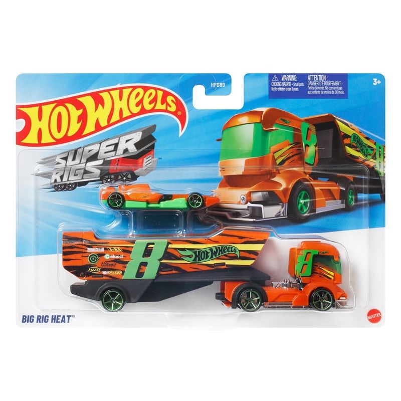 Big Rig Heat + Bad to the Blade Marca do produto: Hot Wheels - Mattel. Coleção: Super Rigs - Caminhões de Transporte Escala: 1/64 (Carrinho: comprimento: 7,5 cm; Caminhão: comprimento 17,5 cm)