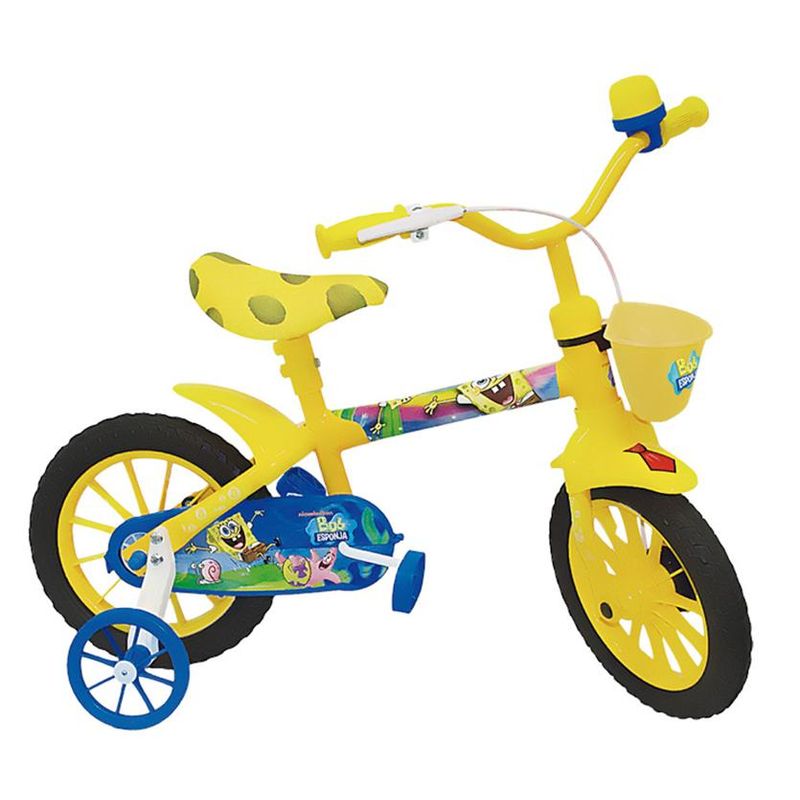Bike Bob Esponja Aro 12 Bicicleta Infantil Nickelodeon – Multibrink Hercules. Bike Bob Esponja - Bicicleta Infantil Multibrink Hercules. Fabricado em aco carbono com tubo central overside, possui uma placa que cobre a corrente evitando possiveis acidentes. A bike vem nas cores amarela e azul com uma lancheira do Bob Esponja e adesivos. Suporta ate 25 Kg. Freio cantilever Slim com capa estofada. Rodas laterais para evitar qualquer risco a crianca. Selim (cela) Estofado(a). Freio a tambor lacrado. Corrente totalmente fechada. Com buzina e cesta porta objetos.