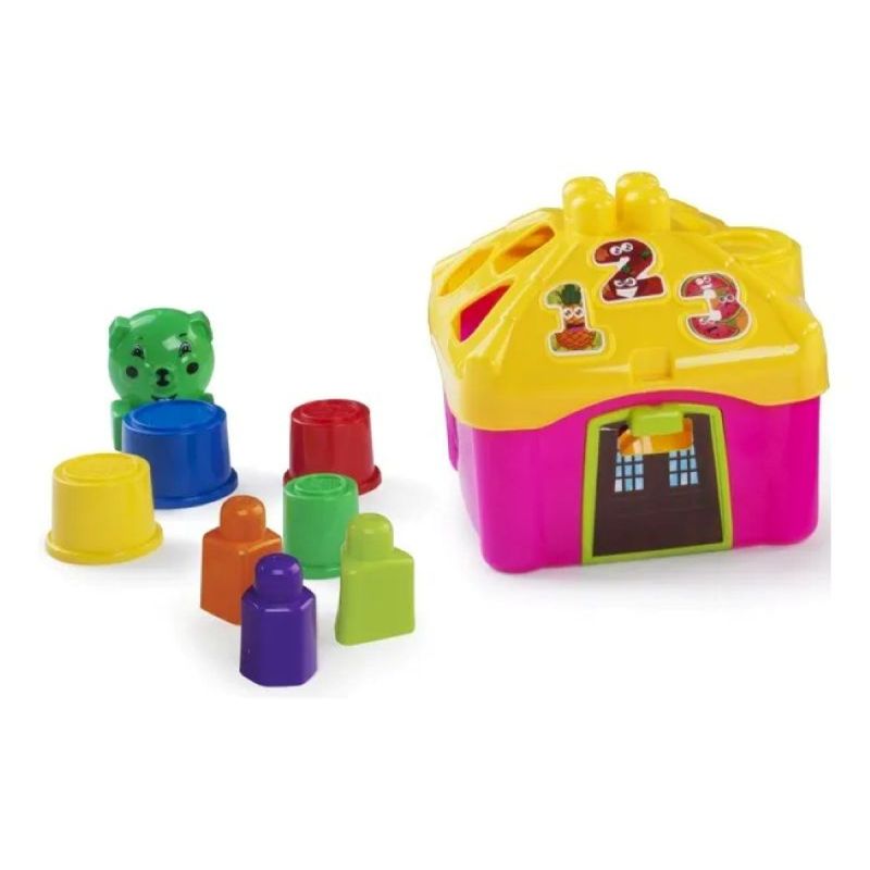 – Conteúdo da Embalagem: Contém: 1 casinha, 1 telhado de encaixe, 4 copos, 1 rostinho e 3 formas geométricas. Acompanha cartela de adesivos.