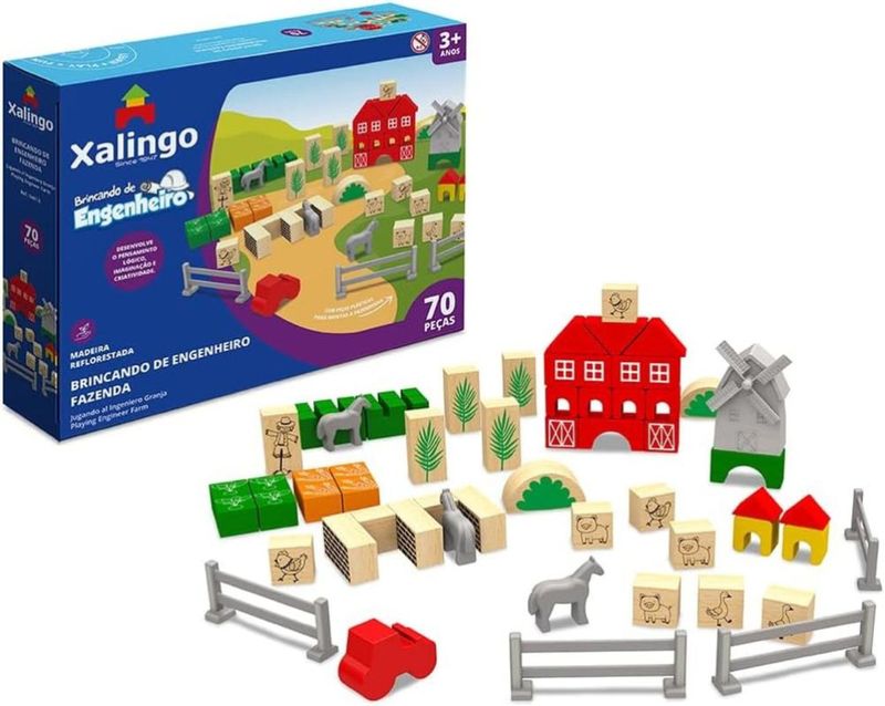 -Brincando De Engenheiro Fazenda é composto com 70 peças em madeira reflorestada e tinta atóxica. -São vários formatos, que possibilitam montagens infinitas, o que faz com que suas criações fiquem do tamanho que você quiser, você pode montar pequenas cidades. -O jogo contribui para o desenvolvimento do pensamento lógico e auxilia nas noções de espaço e coordenação motora da criança, podendo ser utilizado tanto individualmente quanto em grupo. -Indicado para crianças acima de 3 anos. Características: Marca - Xalingo Inclui: 70 Peças Material: Madeira