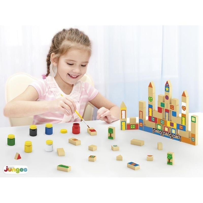 AVISO: IMAGENS MERAMENTE ILUSTRATIVOS!!! Construtor Colorir e Brincar da Junges com 60 peças em madeira de reflorestamento (MDF). Acompanha 6 tintas temperas e 1 pincel para os pequenos artistas se divertirem muito! Elaborado a partir de bloquinhos em MDF de 15mm de espessura, é composto com peças de tamanhos diferentes para colorir e montar a cidade que desejar. Com as peças podem-se montar diversas configurações de cenário, dando à criança maior liberdade para se divertir, criar e brincar. Brinquedo educativo e sensorial. Com ele a criança pode, além de se familiarizar com os formatos das peças, pintá-los como sua imaginação permitir. Ideal para a criança aprender as cores e desenvolver a coordenação motora, atenção e raciocínio lógico! Produto da Linha Incluir & Brincar - criado para estimular o desenvolvimento infantil e promover a inclusão por meio do brincar. Uma seleção feita para todos. Contém: 60 peças, 6 tintas e 1 pincel idade: 4+ anos Material: Madeira Marca:Junges