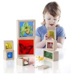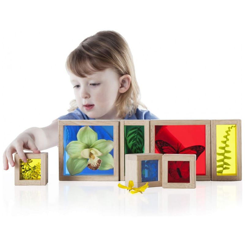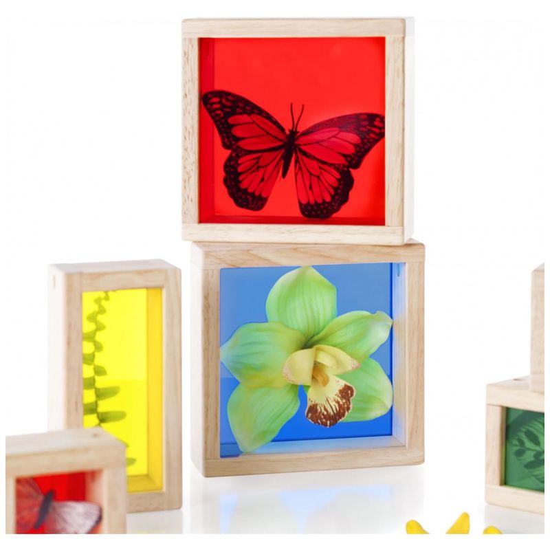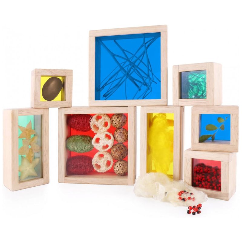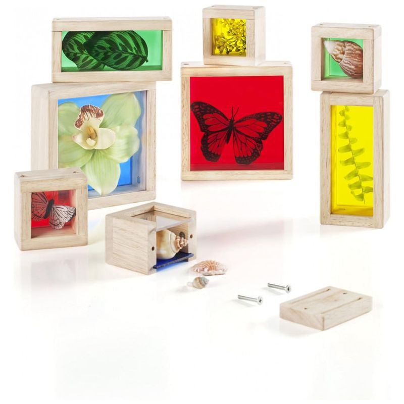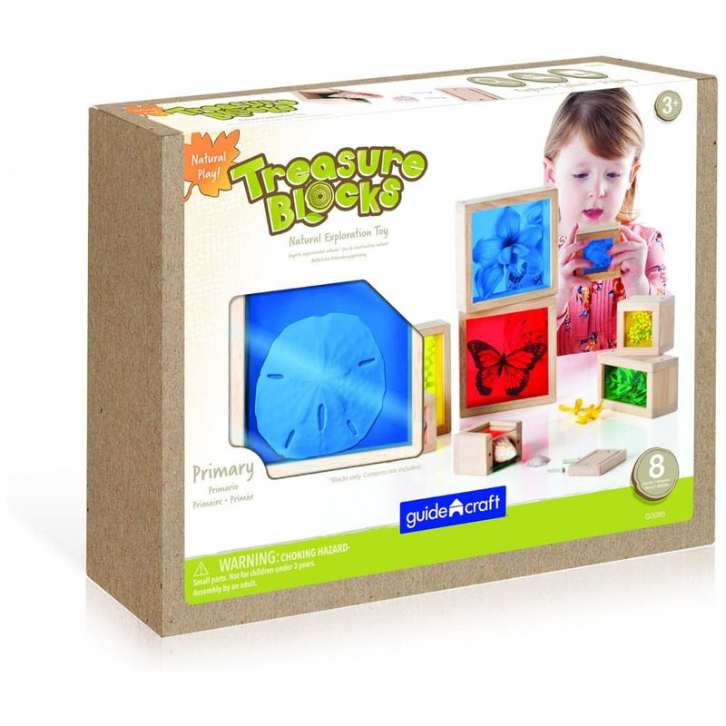 Os Blocos Treasure Blocks Primários da Guidecraft apresentam janelas transparentes coloridas, ideais para observar ou exibir pequenos objetos como contas, folhas e brinquedos. Cada bloco possui painel removível fixado por parafusos para garantir a segurança dos objetos até que sejam substituídos. O maior bloco mede 14 cm de comprimento, 14 cm de largura e 5 cm de altura, projetado para atividades de exploração sensorial, exploração de cores e uso em mesa de luz. O conjunto é voltado para crianças de 3 a 10 anos e é fabricado com madeira de alta qualidade e acrílico durável. Este produto favorece o desenvolvimento de habilidades motoras finas e a compreensão visual por meio do manuseio e empilhamento dos blocos.
