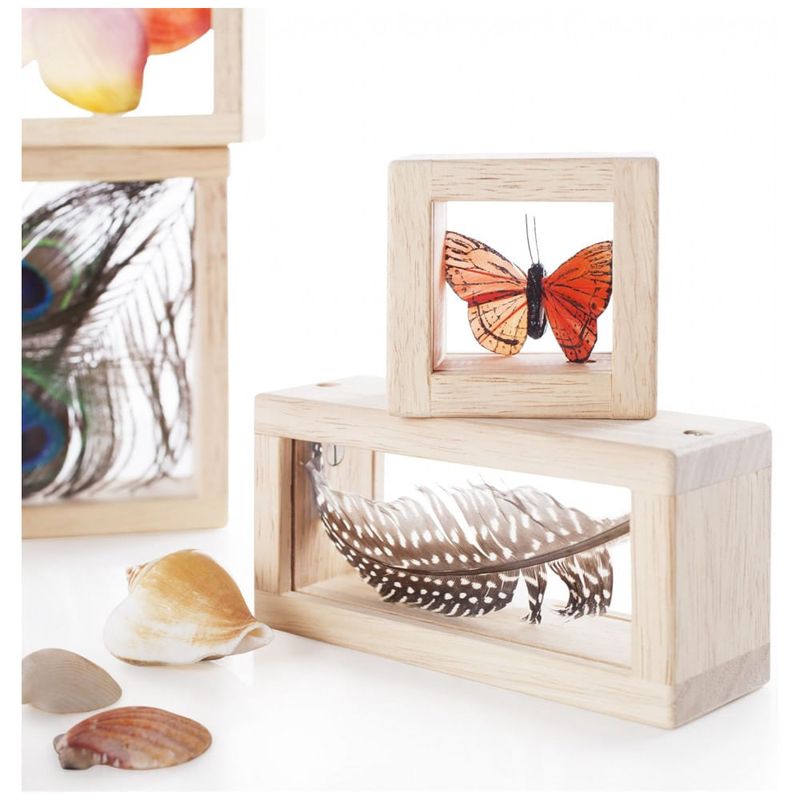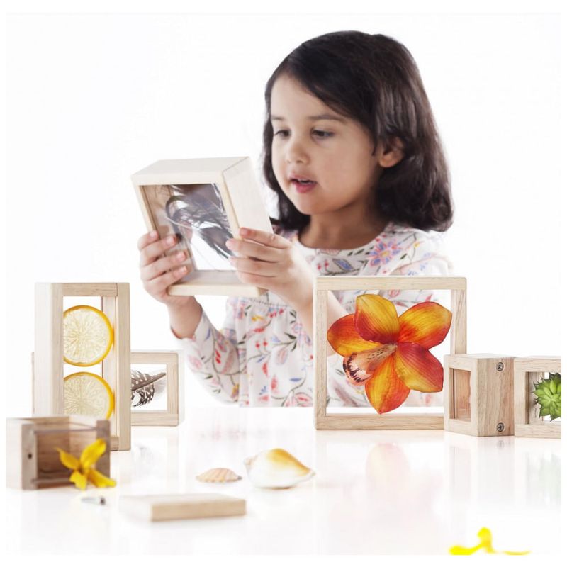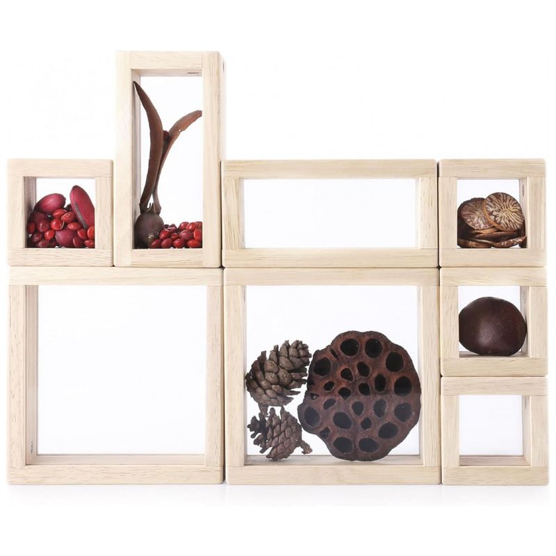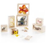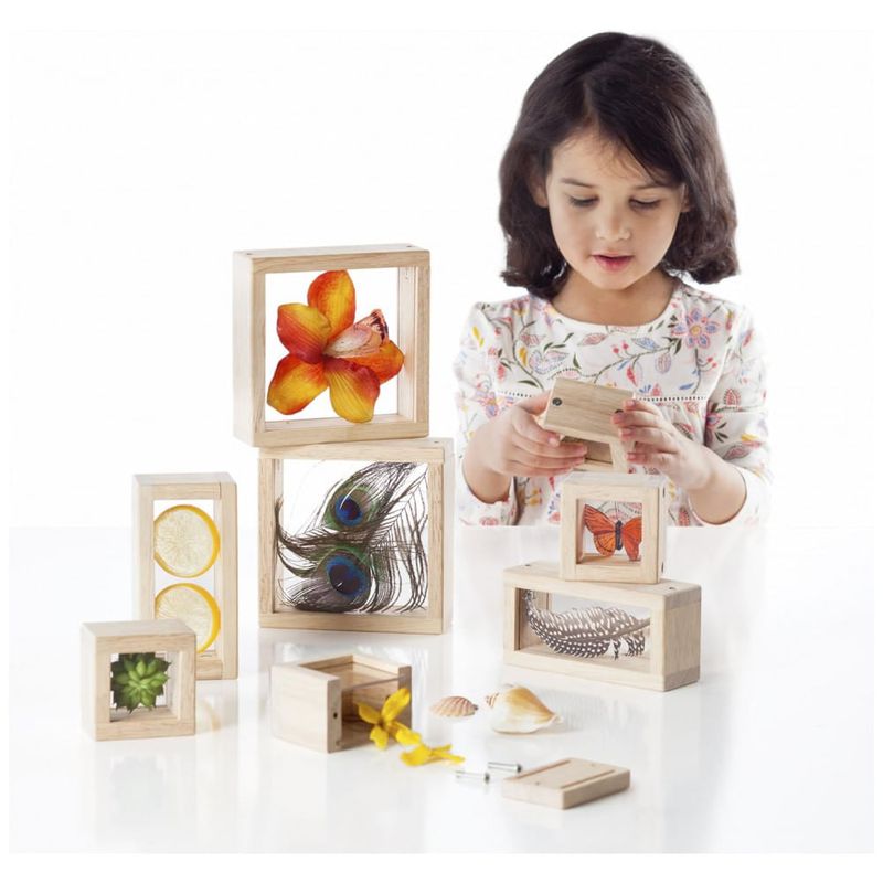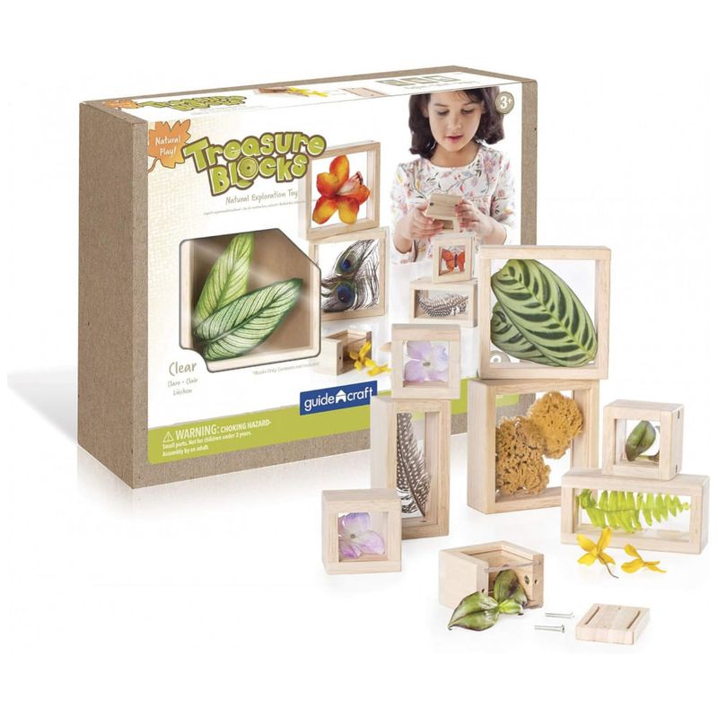 Os Blocos Treasure da Guidecraft são um conjunto de 8 peças de empilhamento em madeira lisa com molduras de hardwood e janelas insetadas de acrílico transparente, equipadas com painel removível fixado por parafusos para inserção segura de objetos pequenos. Cada bloco permite observação e exibição de itens como contas, folhas ou brinquedos pequenos, com o maior modelo medindo 14 cm de comprimento x 14 cm de largura x 5 cm de altura. Projetado para atividades de mesa de luz e exploração visual, o kit suporta construções estáveis a partir de 36 meses até 120 meses, com dimensões compactas da embalagem otimizadas para armazenamento. O modelo XGC-G3084 utiliza materiais duráveis de acrílico e madeira, garantindo fixação segura dos componentes internos até a substituição. A embalagem padrão protege as peças durante o transporte.?