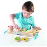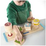 Conteúdo da embalagem: 1 tabuleiro em madeira com alças e conjunto de formas geométricas coloridas rosqueáveis?