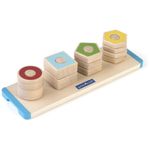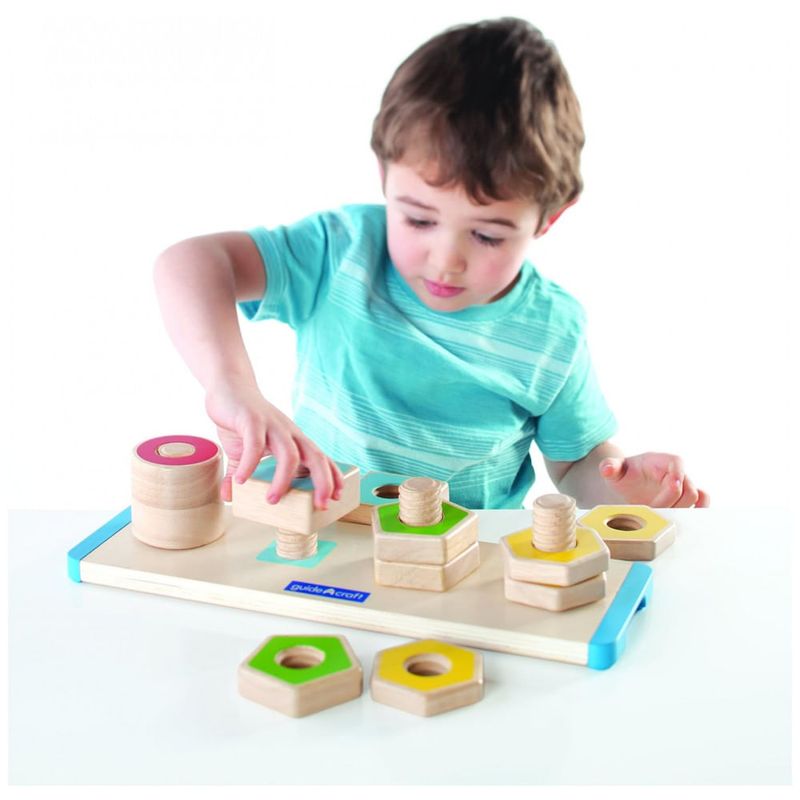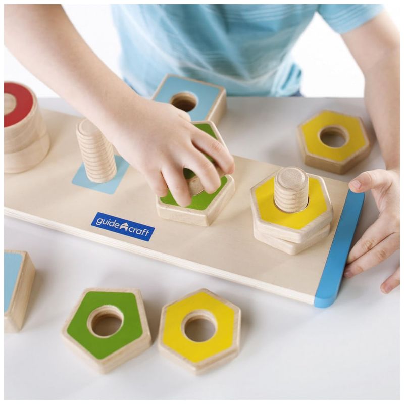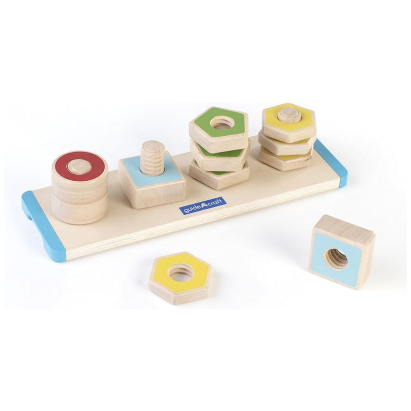 O brinquedo Guidecraft Colorful Count and Twist Geometric Shapes é um tabuleiro educativo em madeira desenvolvido para crianças a partir de 2 anos, focado em reconhecimento de cores e formas, coordenação motora fina e primeiras noções de frações. A base em madeira possui parafusos fixos nos quais a criança rosqueia porcas coloridas em formatos geométricos conhecidos, como círculos, quadrados e outros polígonos.?