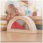 Os blocos têm tamanho compatível com medidas de blocos de unidade padrão, o que permite integrá-los a construções em madeira já existentes em sala de aula ou em casa. As molduras em madeira de seringueira (rubberwood) são lixadas e arredondadas, com janelas em plexiglas colorido, projetadas para suportar o uso frequente em ambientes educacionais e domésticos.