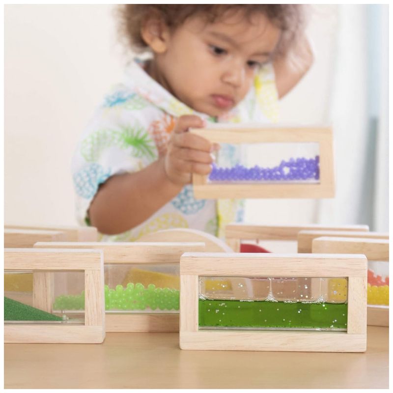 Conteúdo da embalagem: 18 blocos sensoriais em madeira com janelas coloridas preenchidas com água, areia e miçangas