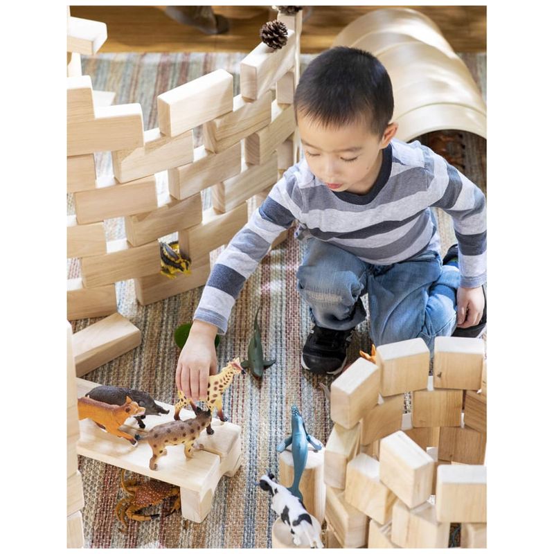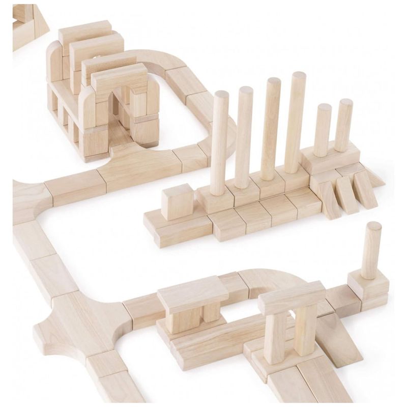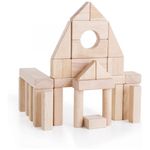O Conjunto de Blocos Unitários Guidecraft Set E compreende 218 peças em madeira de borracha (rubberwood) lixada suavemente para acabamento resistente. Inclui 48 blocos unitários, 28 meias unidades, 8 duplos, 4 quádruplos, 12 rampas, 10 triângulos, 8 cilindros grandes, 10 pequenos, 10 pilares, 10 triângulos pequenos, 10 meias colunas, 10 meias cilindros, 10 arcos romanos, 6 tábuas de telhado, 4 de piso, 4 semicírculos, 6 arcos góticos, 4 contrafortes pequenos, 4 curvas de quarto de círculo, 4 quartos de círculo, 2 interseções, 4 curvas semicirculares e 2 estradas laterais. As peças seguem o padrão unitário baseado em dimensões de 3,5 cm x 7,1 cm x 14 cm, permitindo construções modulares precisas para atividades de empilhamento e arquitetura. Este conjunto expande opções de montagem com formas variadas, compatível com outros sets unitários para configurações maiores. Fabricado pela Guidecraft, modelo G2151, adequado para idades a partir de 24 meses até 84 meses, com embalagem de dimensões aproximadas 46 cm x 74 cm x 74 cm.?