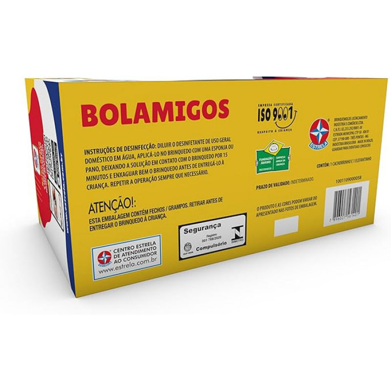 Os Bolamigos da Estrela são dois simpáticos animais em formato de bola, o Elefantinho e o Cachorrinho, feitos de vinil decorado, macio e lavável. Divertidos e seguros, são ideais para acompanhar os primeiros momentos de brincadeira dos bebês.