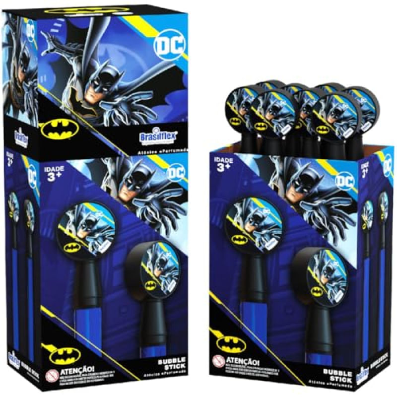 Se divirta com o Batman e com as enormes bolhas que podem alcancar alturas impressionantes, o Bubble Stick Batman Classico vem acompanhado de uma solucao de bolhas de 130ml. Basta mergulhar a extremidade do Bubble Stick na mesma, levanta-lo suavemente e girar o pulso para criar bolhas gigantes que flutuam no ar.