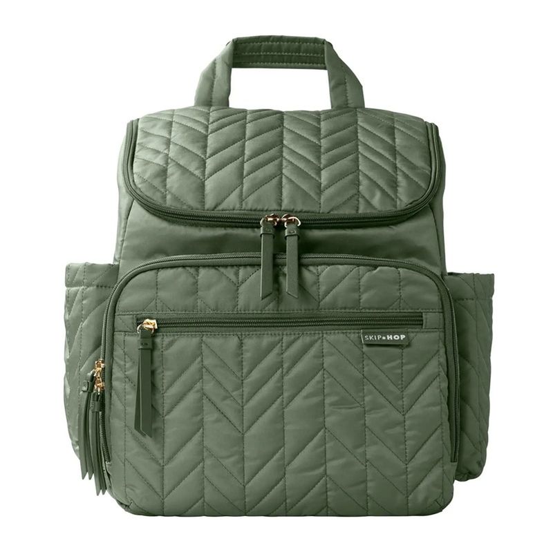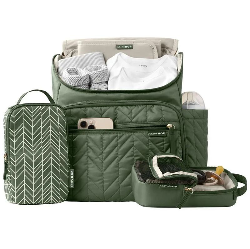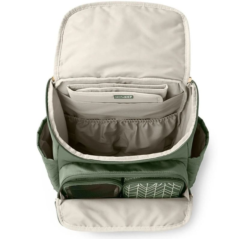 A Mochila Forma da Skip Hop é acolchoada e leve, com várias divisórias para os itens essenciais do bebê.