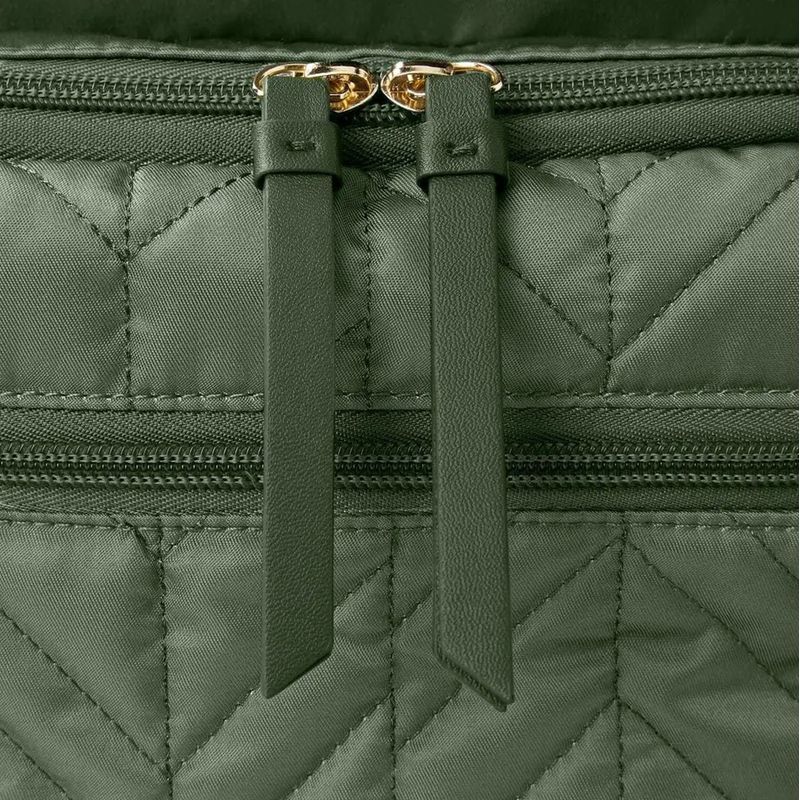 O compartimento frontal inclui uma bolsa térmica para mamadeira e um organizador de roupas. Tudo fica ao seu alcance com bolsos internos elásticos e bolsos laterais isolados para garrafas.