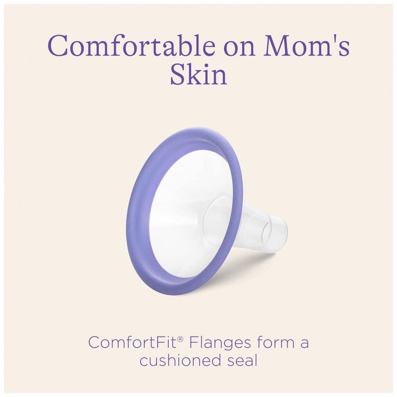 CONFORTÁVEL PARA A MÃE Os flanges ComfortFit têm um aro macio e flexível que é macio na pele da mãe, mantendo uma boa vedação para uma sucção ideal.