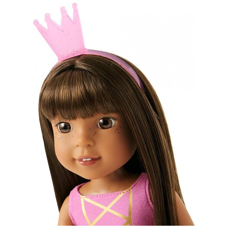 Boneca Ashlyn de que tem o tamanho certo para meninas mais novas. Ela tem olhos castanhos, bochechas sardentas e longos cabelos castanhos sedosos que podem ser escovados e penteados.